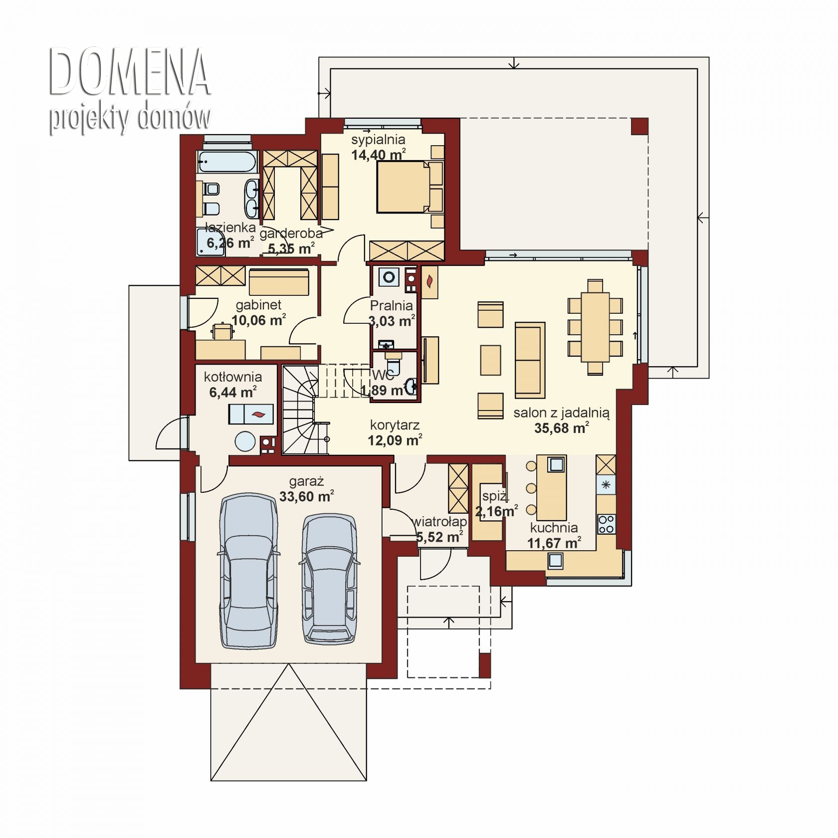 Przedsionek z miejscem na szafę otwiera się na strefę dzienną, składającą się z przestronnego salonu połączonego z jadalnią oraz kuchnią z wydzieloną spiżarnią. Z funkcjonalnego holu mamy dostęp na poddasze, do wc i pralni, dodatkowego pokoju, który może pełnić funkcję gabinetu oraz modułu składającego się z sypialni, garderoby i łazienki. Część gospodarcza to z dwustanowiskowy garaż, poprzez który dostępne jest obszerne pomieszczenie gospodarcze (kotłownia) z wyjściem do ogrodu.