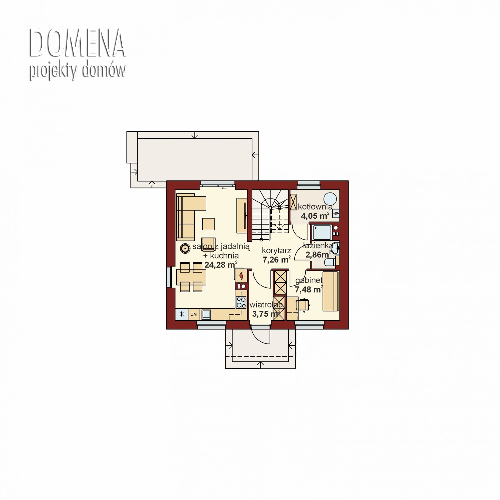 Przedsionek z miejscem na szafę otwiera się na strefę dzienną, składającą się z przestronnego salonu połączonego z jadalnią oraz kuchnią. Z funkcjonalnego holu mamy dostęp do łazienki, dodatkowego pokoju, który może pełnić funkcję gabinetu oraz kotłowni.
