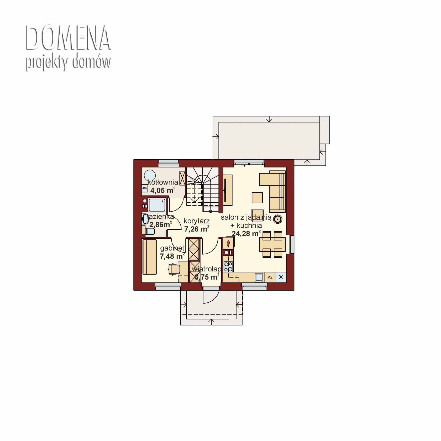 Przedsionek z miejscem na szafę otwiera się na strefę dzienną, składającą się z przestronnego salonu połączonego z jadalnią oraz kuchnią. Z funkcjonalnego holu mamy dostęp do łazienki, dodatkowego pokoju, który może pełnić funkcję gabinetu oraz kotłowni.