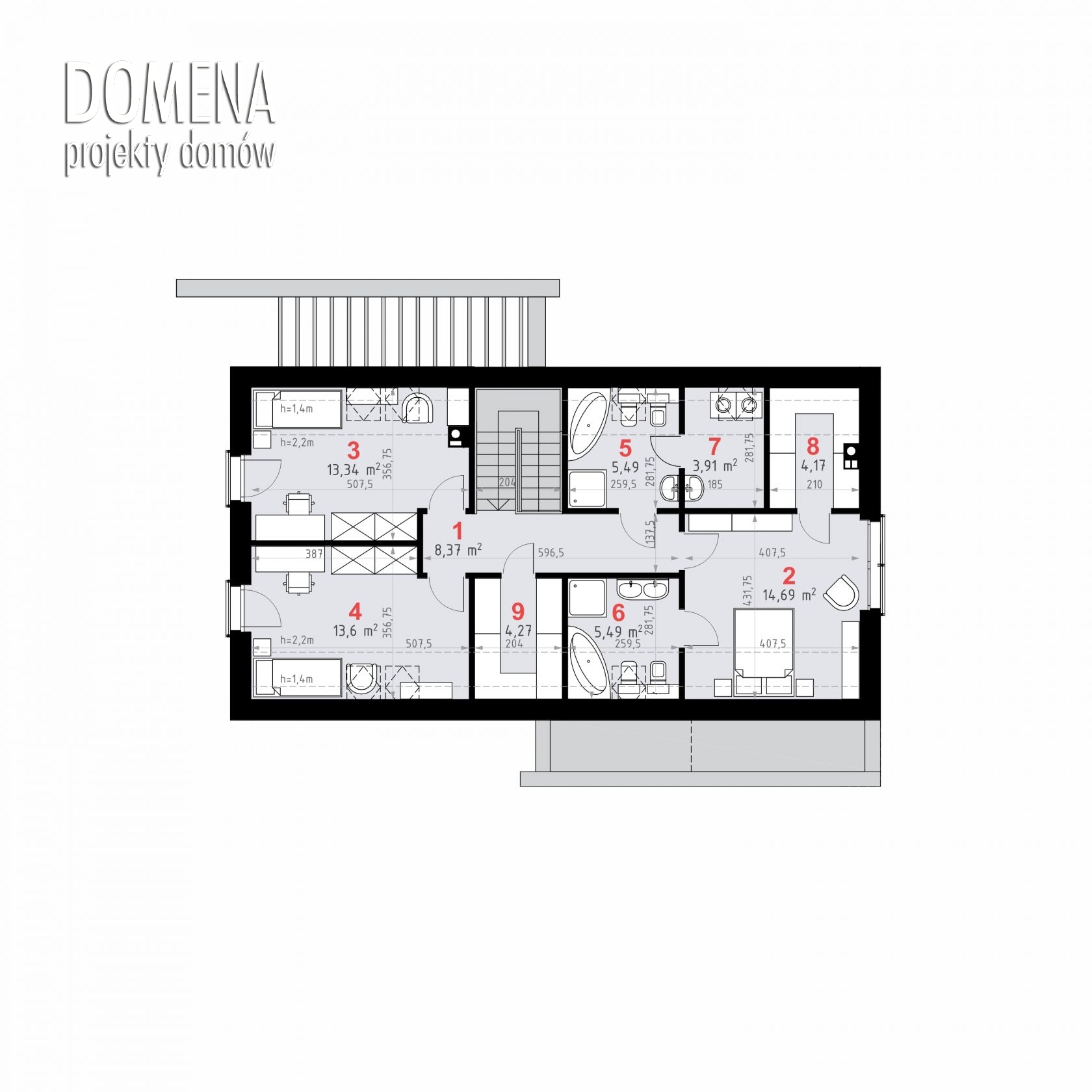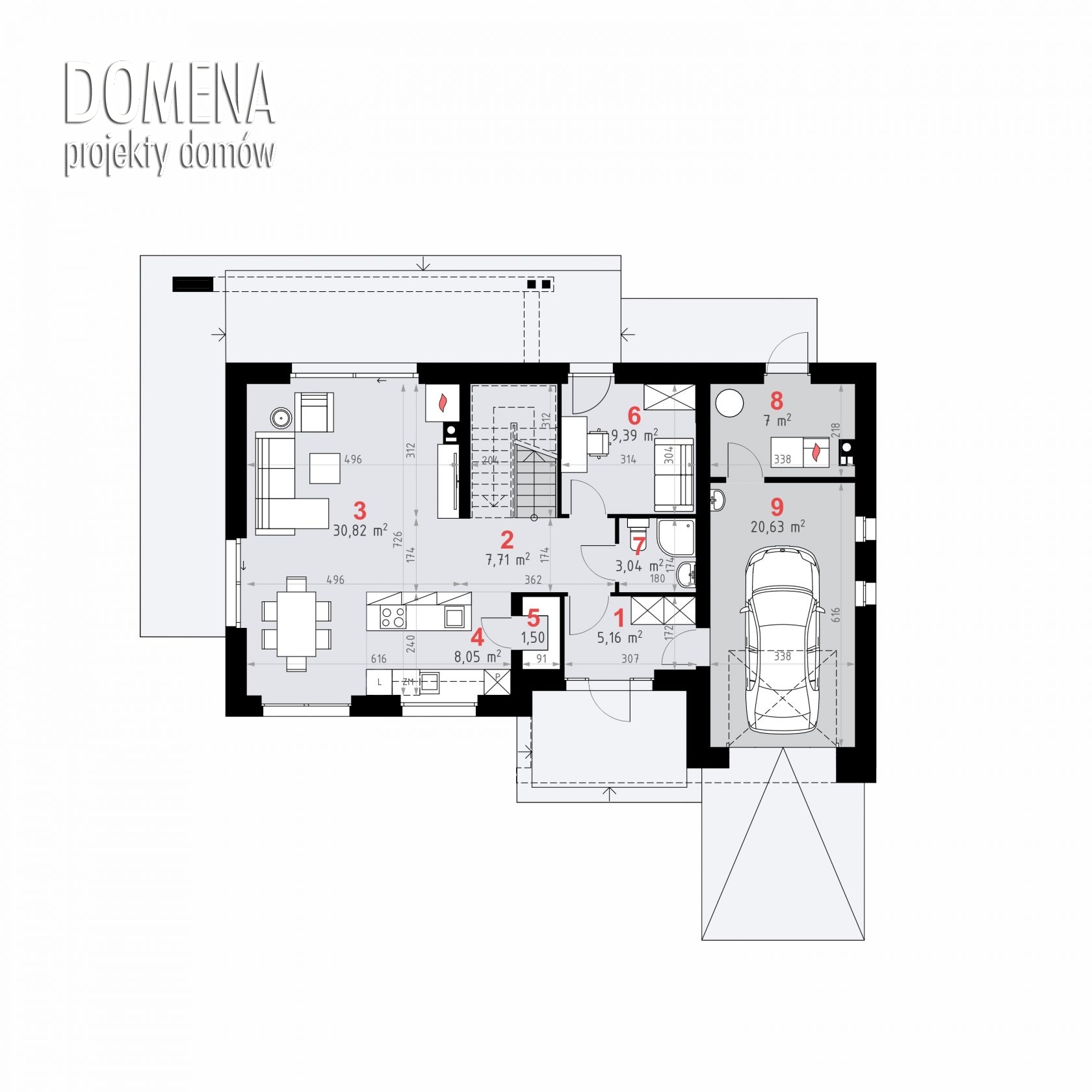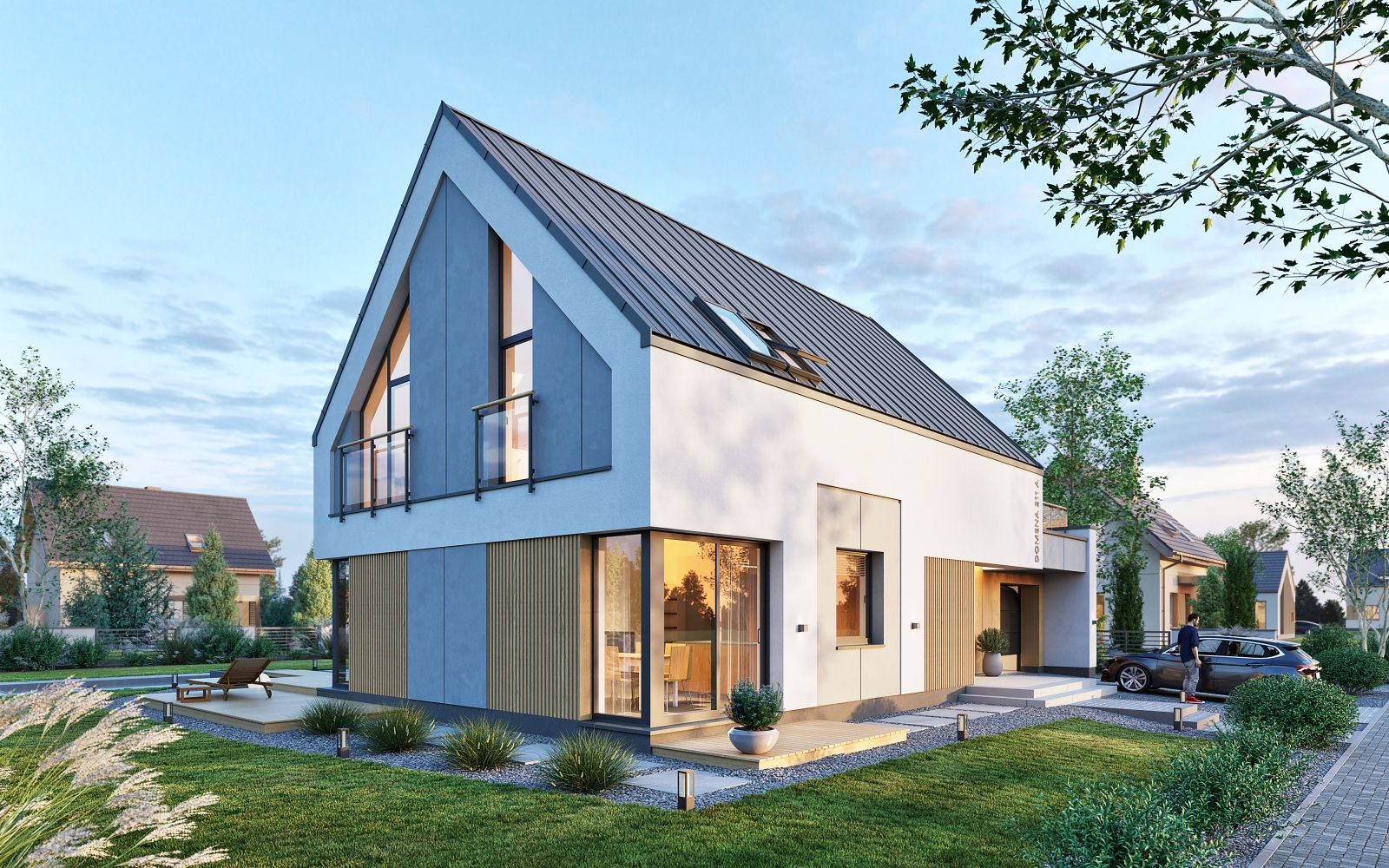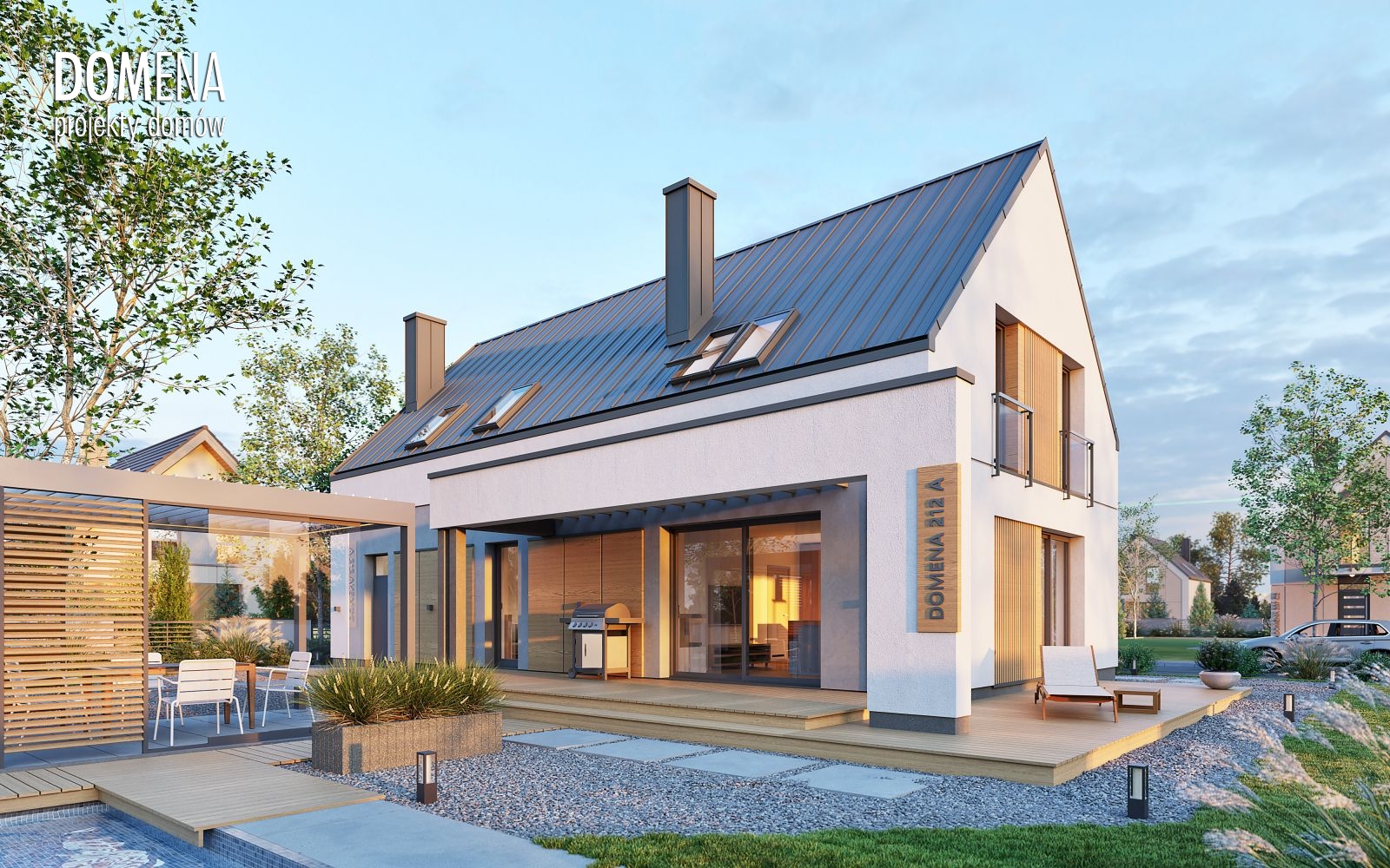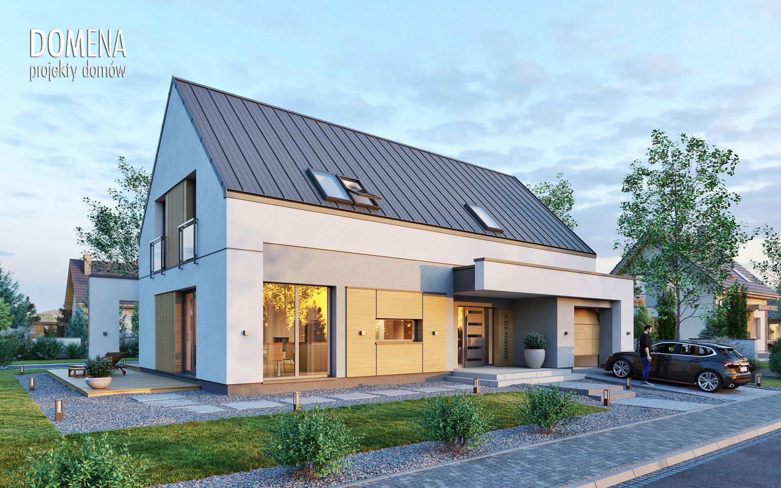DOMENA 212 A to dom dla 4-5 osobowej rodziny, należy do serii nowoczesnych domów z poddaszem oraz garazem na dwa stanowiska.