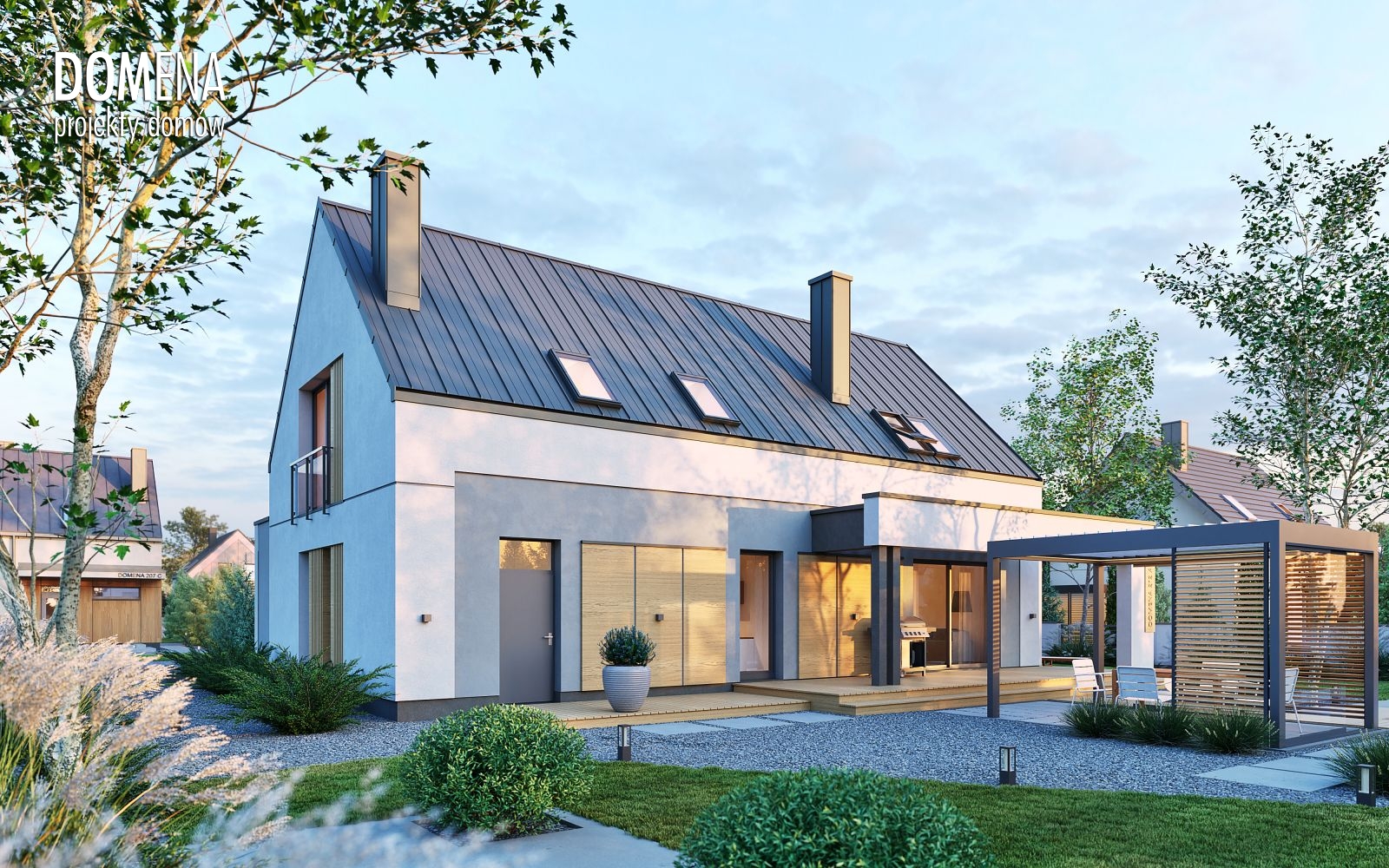 Wizualizacja jest propozycją tego jak dany projekt domu oraz jego otoczenie można zaaranżować. Sposób prowadzenia tarasu, kształt murków i elementy małej architektury typu pergole, donice itp. nie są objęte zakresem projektu. W związku z powyższym na projekcie budowlanym elementy te mogą nie być uwzględnione w projekcie (patrz pergole) lub zmieniony może być ich kształt i sposób prowadzenia (wielkości tarasów, profil murków)