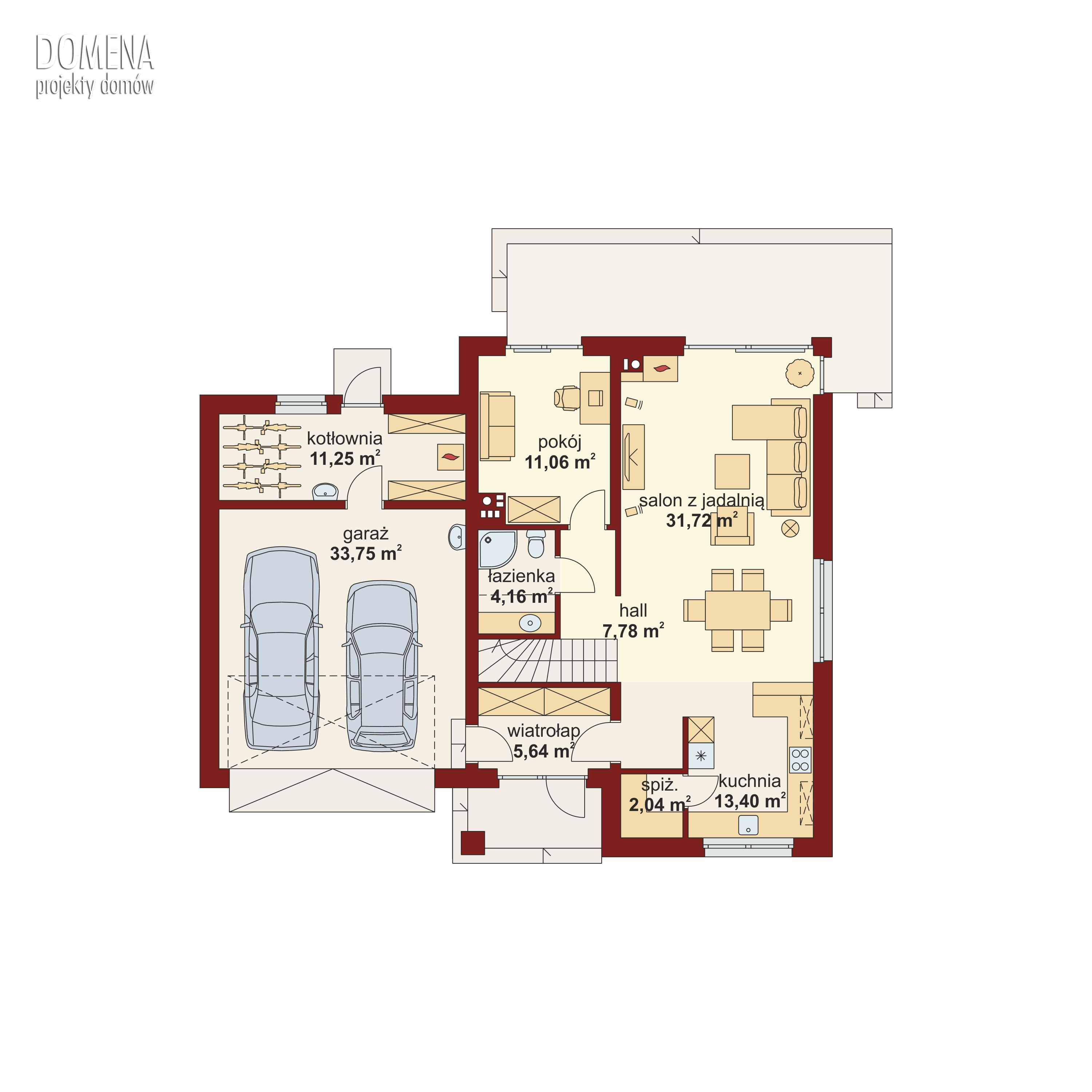 Bryła DOMENY 311 B została stworzona z myślą o 4-5-osobowej rodzinie.Przedsionek z miejscem na szafę prowadzi do strefy dziennej oraz części gospodarczej. Strefa dzienna składają się z przestronnego salonu połączonego z jadalnią oraz kuchnią ze spiżarnią (którą można z łatwością oddzielić). Z holu mamy dostęp na poddasze, do łazienki i dodatkowego pokoju. Część gospodarcza składająca się z dwustanowiskowego garażu, poprzez który dostępne jest obszerne pomieszczenie gospodarcze (kotłownia) z wyjściem do ogrodu. Na poddaszu znajdują się trzy sypialnie (każda z własną garderobą), bogato wyposażona, duża łazienka z częścią pralni (którą można z łatwością oddzielić) oraz dostępny z wysokiego półpiętra strych.