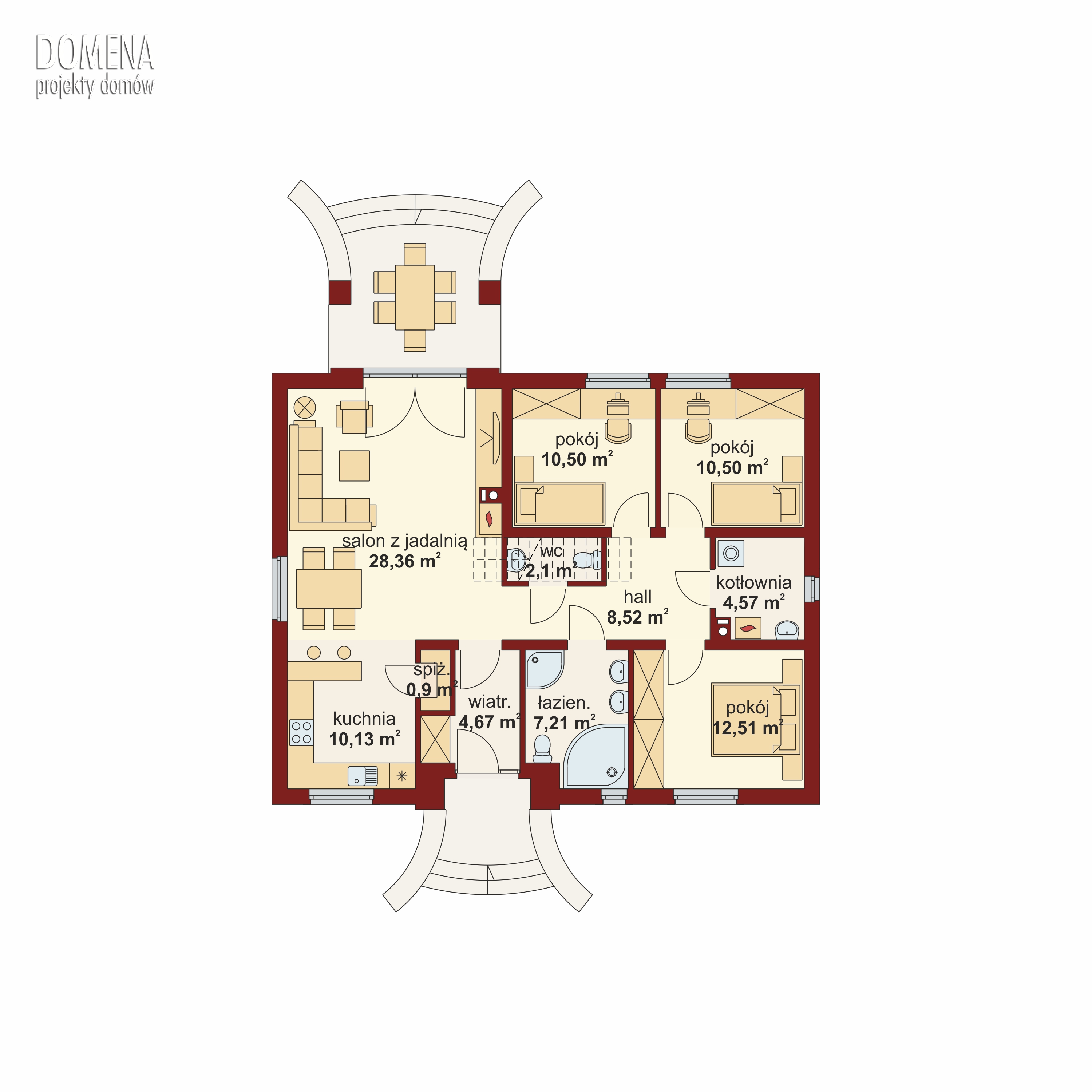 Projekt w standardzie posiada dodatkowo instalację rekuperacji oraz ogrzewanie kominikiem z płaszczem wodnym.