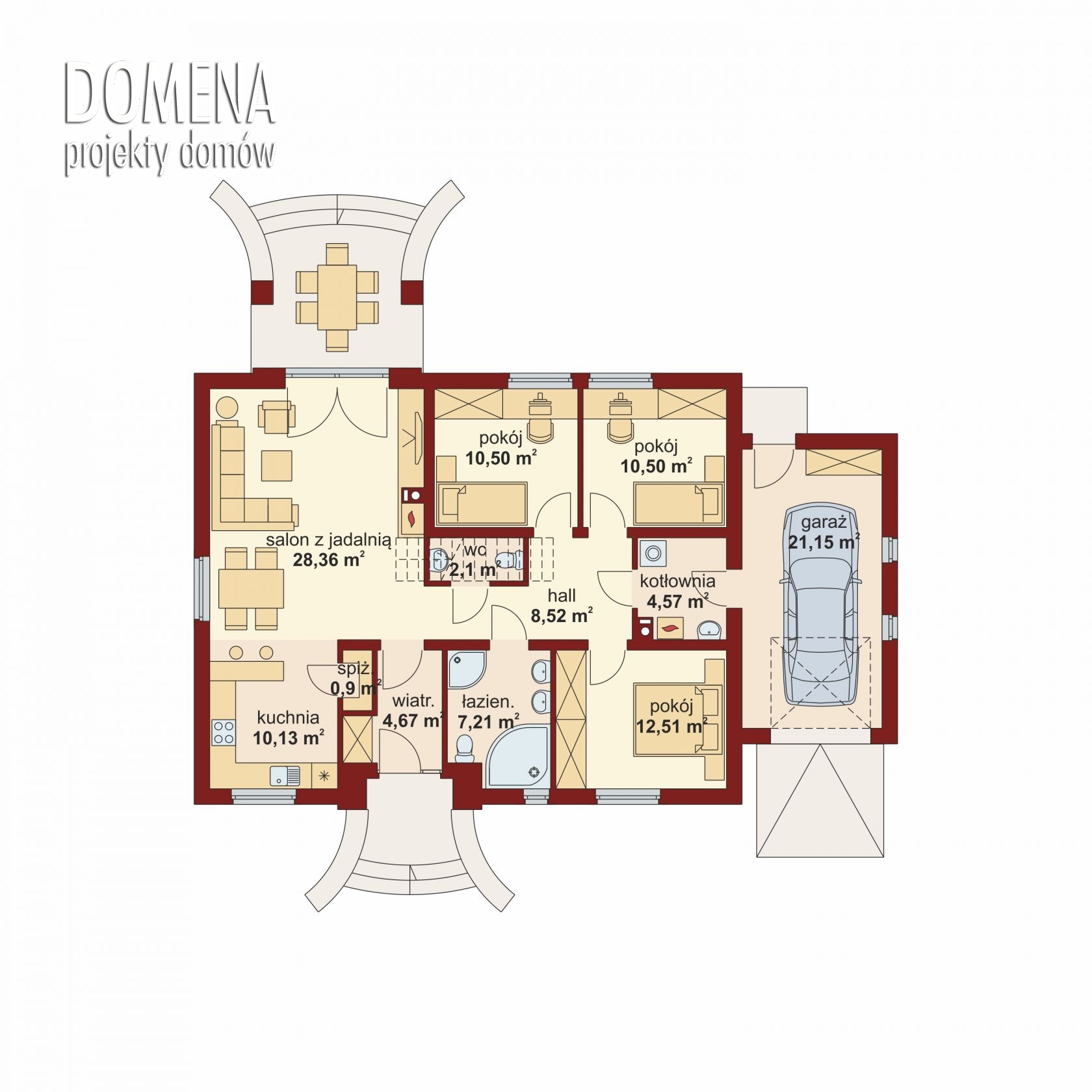 Elian jest zaprojektowany z myślą o 4-5 osobowej rodzinie. Ma klasyczną prostą formę, co korzystnie wpływa na oszczędność związaną z ogrzewaniem domu oraz samą jego budową. Budynek posiada wyraźny podział na strefy: dzienną, nocną i gospodarczą. Zaraz po przekroczeniu wiatrołapu ukazuje się pierwsza z nich – połączony z jadalnią salon z szerokim widokiem na zadaszony taras. Jadalnia płynnie przechodzi w kuchnię, którą po dostawieniu ścianki działowej możemy przekształcić w zamkniętą. Zaprojektowano także dostępną od strony kuchni spiżarnię. Większą przestrzeń na szafy w wiatrołapie można uzyskać decydując się na jej likwidację. Część nocną stanowią trzy sypialnie, jasna łazienka oraz toaleta. Istnieje możliwość przekształcenia poddasza w przestrzeń użytkową. Po usytuowaniu schodów w miejscu toalety, na poddaszu powstaje przestrzeń na dodatkową sypialnię czy pokój hobby. Strefa gospodarcza to kotłownia, przez którą można się dostać do garażu, w którym z kolei założono praktyczne wyjście od strony ogrodowej.