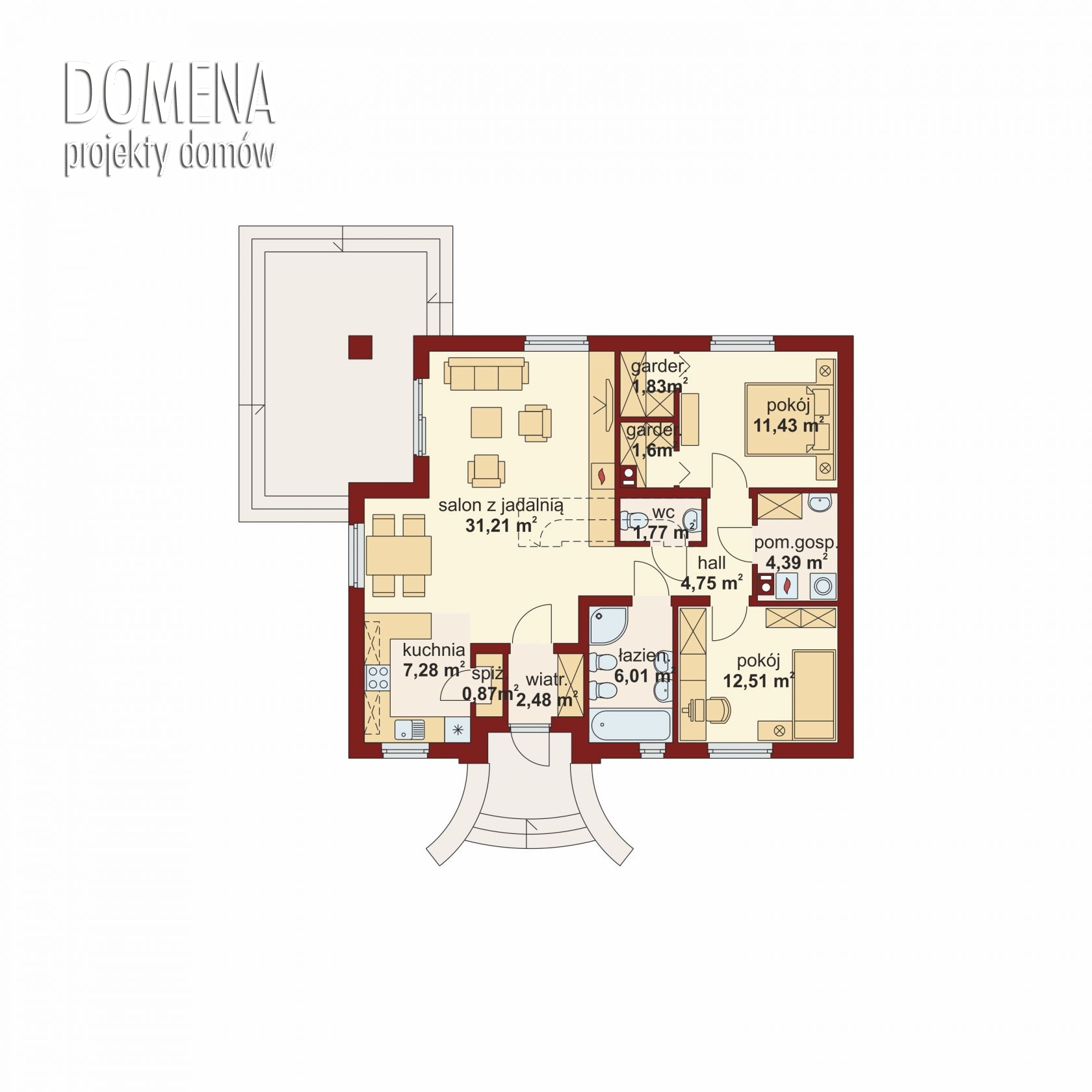 Eliasz jest zaprojektowany z myślą o 3 osobowej rodzinie. Ma klasyczną prostą formę, co korzystnie wpływa na oszczędność związaną z ogrzewaniem domu oraz samą jego budową. Budynek posiada wyraźny podział na strefy: dzienną, nocną i gospodarczą. Zaraz po przekroczeniu wiatrołapu ukazuje się pierwsza z nich – połączony z jadalnią salon z szerokim widokiem na zadaszony taras. Jadalnia płynnie przechodzi w kuchnię, którą po dostawieniu ścianki działowej możemy przekształcić w zamkniętą. Zaprojektowano także dostępną od strony kuchni spiżarnię. Większą przestrzeń na szafy w wiatrołapie można uzyskać decydując się na jej likwidację. Część nocną stanowią trzy sypialnie, jasna łazienka oraz toaleta. Istnieje możliwość przekształcenia poddasza w przestrzeń użytkową. Po usytuowaniu schodów w miejscu toalety, na poddaszu powstaje przestrzeń na dodatkową sypialnię czy pokój hobby.