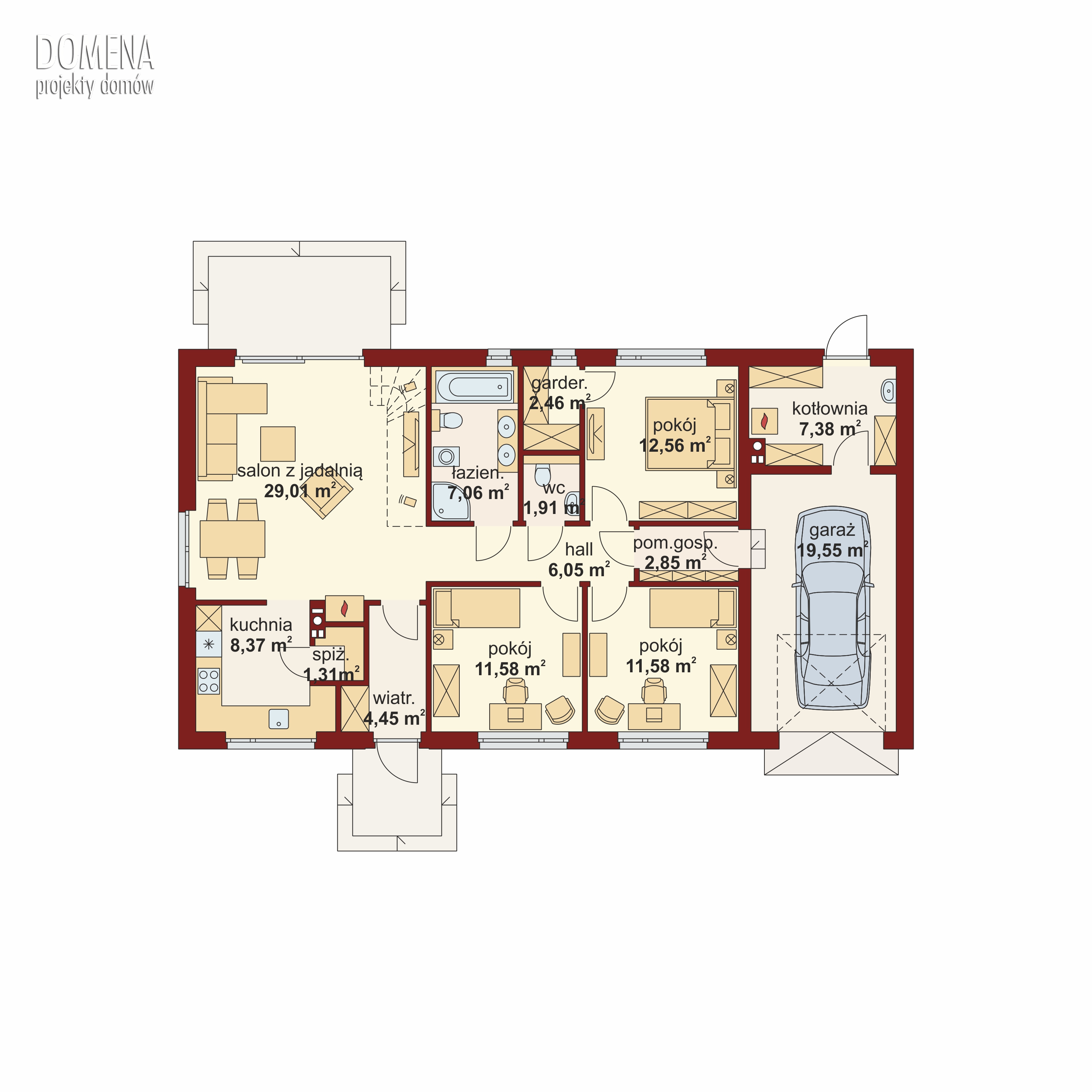 Strefa dzienna składa się z przestronnego salonu połączonego z jadalnią, oraz wydzielonej kuchni (którą można z łatwością połączyć z resztą wnętrza), spiżarni, łazienki oraz dodatkowego wc. W ustronniejszej części domu znajdują się trzy sypialnie (główna z własną garderobą) oraz praktyczne pomieszczenie gospodarcze łączące główną część domu z garażem oraz pojemną kotłownią z wyjściem do ogrodu.