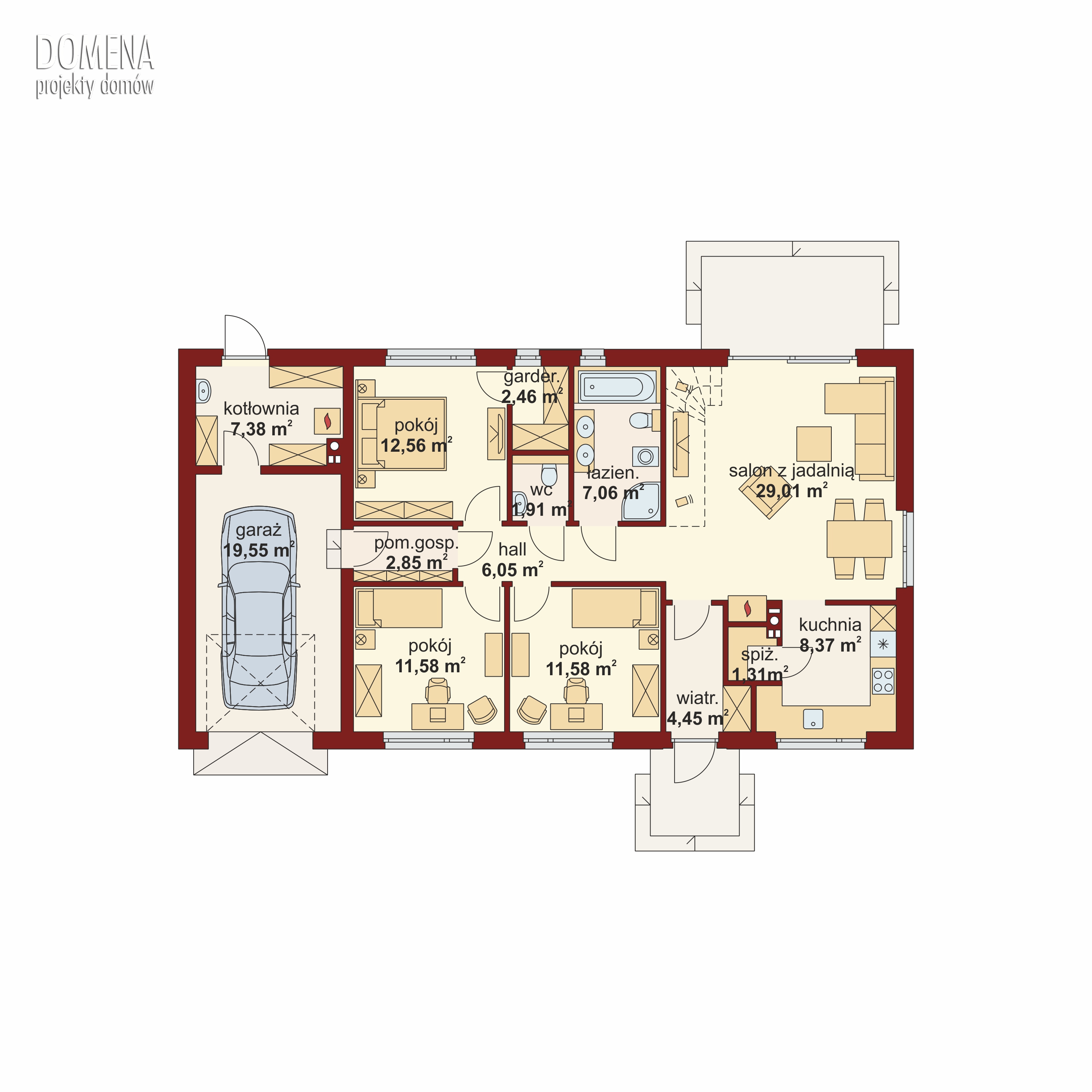Strefa dzienna składa się z przestronnego salonu połączonego z jadalnią, oraz wydzielonej kuchni (którą można z łatwością połączyć z resztą wnętrza), spiżarni, łazienki oraz dodatkowego wc. W ustronniejszej części domu znajdują się trzy sypialnie (główna z własną garderobą) oraz praktyczne pomieszczenie gospodarcze łączące główną część domu z garażem oraz pojemną kotłownią z wyjściem do ogrodu.