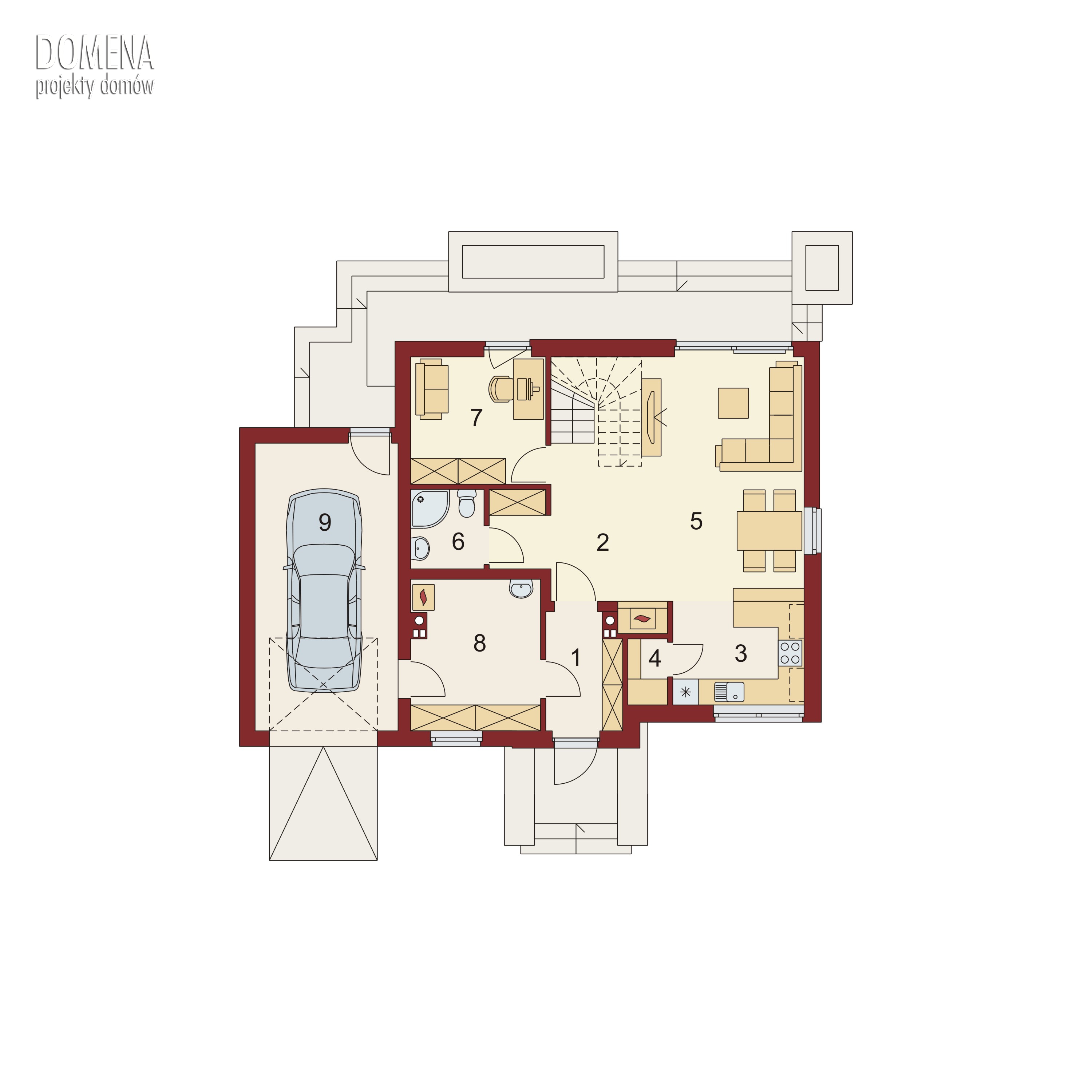 Filomena PS wyróżnia się bogatą funkcjonalnością, dostępną nawet na niewielkiej działce. Komfort każdej 4-5 osobowej rodzinie zapewni też elastyczność układu: możliwość zamknięcia kuchni, czy dodatkowy pokój z łazienką na parterze (mogący służyć jako gościnny, gabinet lub dodatkowa sypialnia). Kompletu atutów dopełnia otwierający się na salon kominek, hojnie wygospodarowane miejsce na odzież w przedsionku, spiżarnia, strych i garaż z praktycznym przejściem przez część gospodarczą do mieszkania. Strefa nocna na poddaszu składa się z trzech pojemnych sypialni oraz obszernej łazienki, połączonej ze strychem mogącym służyć jako suszarnia.