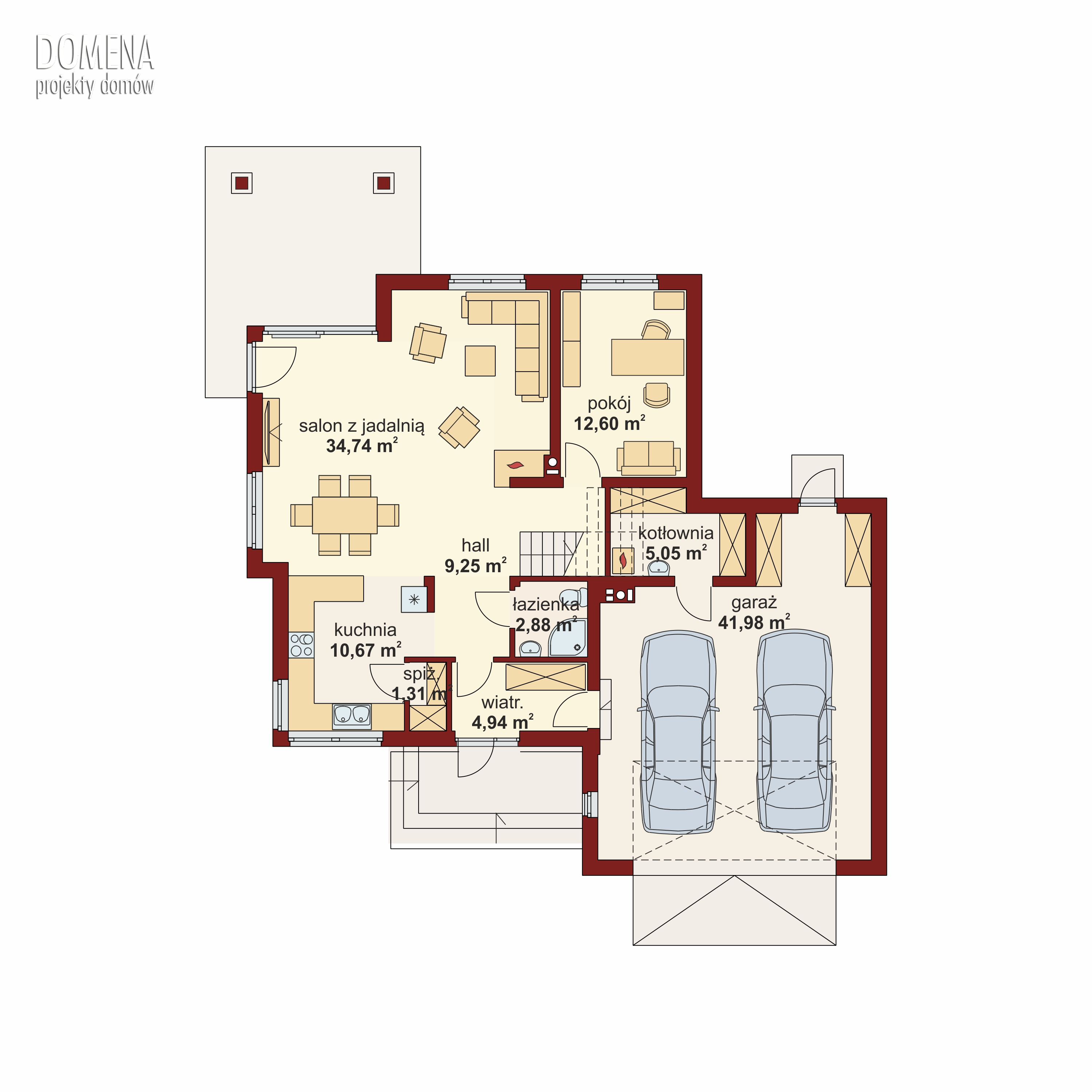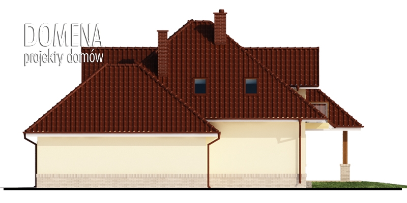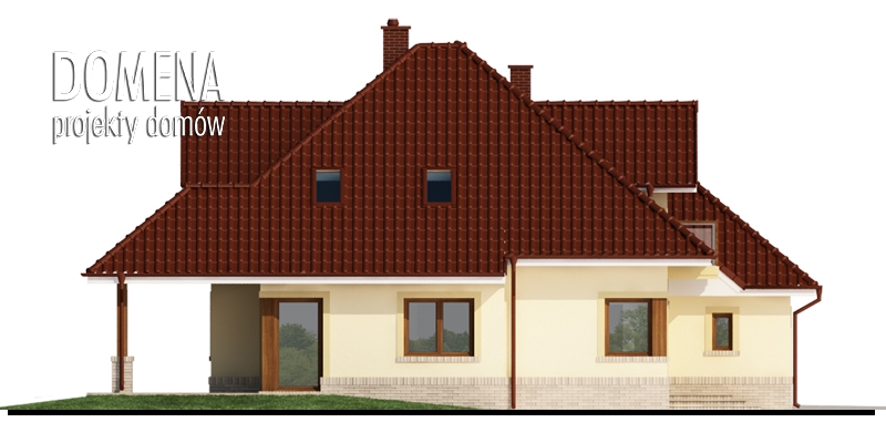 Flawia 2 to dom idealny dla rodziny 4-5 osobowej o klasycznej tradycyjnej bryle. Zaprojektowano go zgodnie z zasadą podziału na strefę dzienną i nocną. Po minięciu wiatrołapu wkracza się do strefy dziennej, gdzie otwiera się przestrzeń z salonem, jadalnią i kuchnią. Salon z kominkiem i wyjściem na taras z dużym zadaszeniem graniczy z częścią jadalnianą, która z kolei bezpośrednio sąsiaduje ze strefą kuchenną. Bardzo dobrze doświetlona kuchnia posiada dostęp do spiżarni. Może ona także funkcjonować jako zamknięta dzięki dostawieniu ścianek działowych. Jeśli chcemy powiększyć kuchnię, bądź zyskać dodatkowe miejsce na szafę w wiatrołapie, możemy to osiągnąć kosztem spiżarni. Na parterze znajduje się także dodatkowy pokój, łazienka z natryskiem oraz garaż i pomieszczenie gospodarcze. Bezpośrednio z wiatrołapu wchodzi się do dwustanowiskowego garażu, z którego z kolei zaaranżowano wyjście do ogrodu oraz dostęp do pomieszczenia gospodarczego. Jest możliwość powiększenia tego ostatniego prawie dwukrotnie, wykorzystując przestrzeń przy drzwiach wychodzących na ogród. Poddasze to w całości strefa nocna. Składa się z trzech sypialni, każda z wyjściem na balkon, a jedna dodatkowo z indywidualną łazienką i garderobą oraz z łazienki.