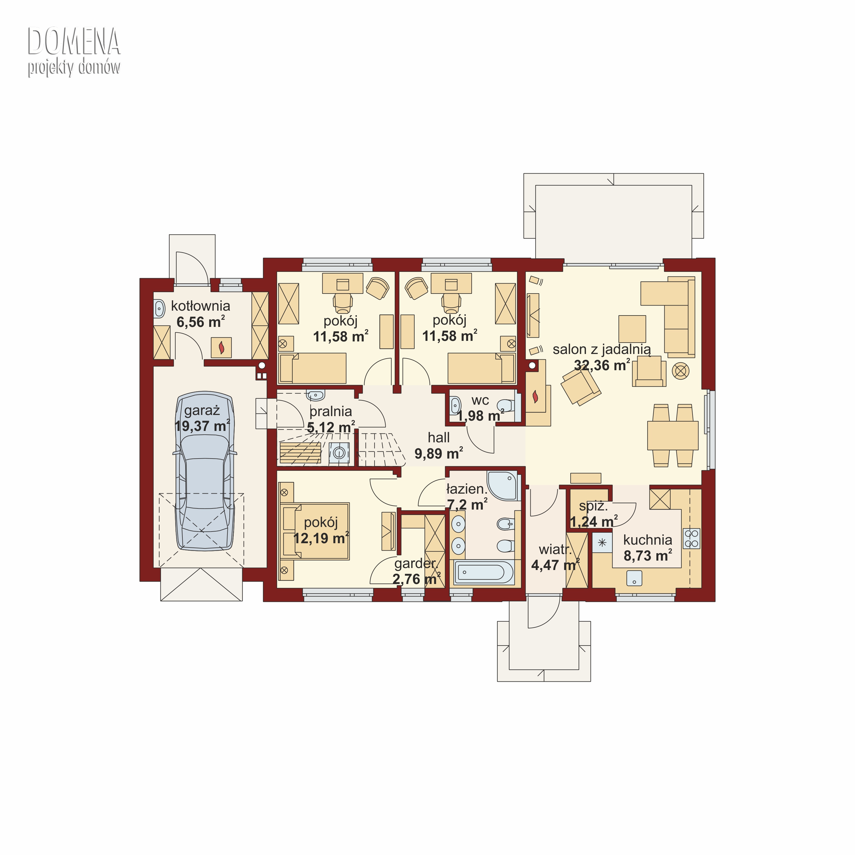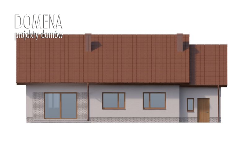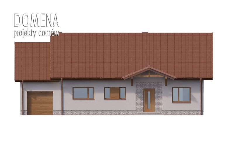 Pojemny przedsionek z miejscem na szafę zapewnia jednoczesny dostęp do strefy dziennej i nocnej. Pierwsza składa się z przestronnego salonu połączonego z jadalnią, wydzielonej kuchni (którą można z łatwością połączyć z resztą wnętrza) oraz spiżarni. Strefa nocna, ustronnie zlokalizowana za pomieszczeniami wc i bogato wyposażonej łazienki, składa się z trzech sypialni (główna z własną garderobą) oraz pomieszczenia gospodarczego, łączącego główną część domu z garażem i obszerną kotłownią z wyjściem do ogrodu.