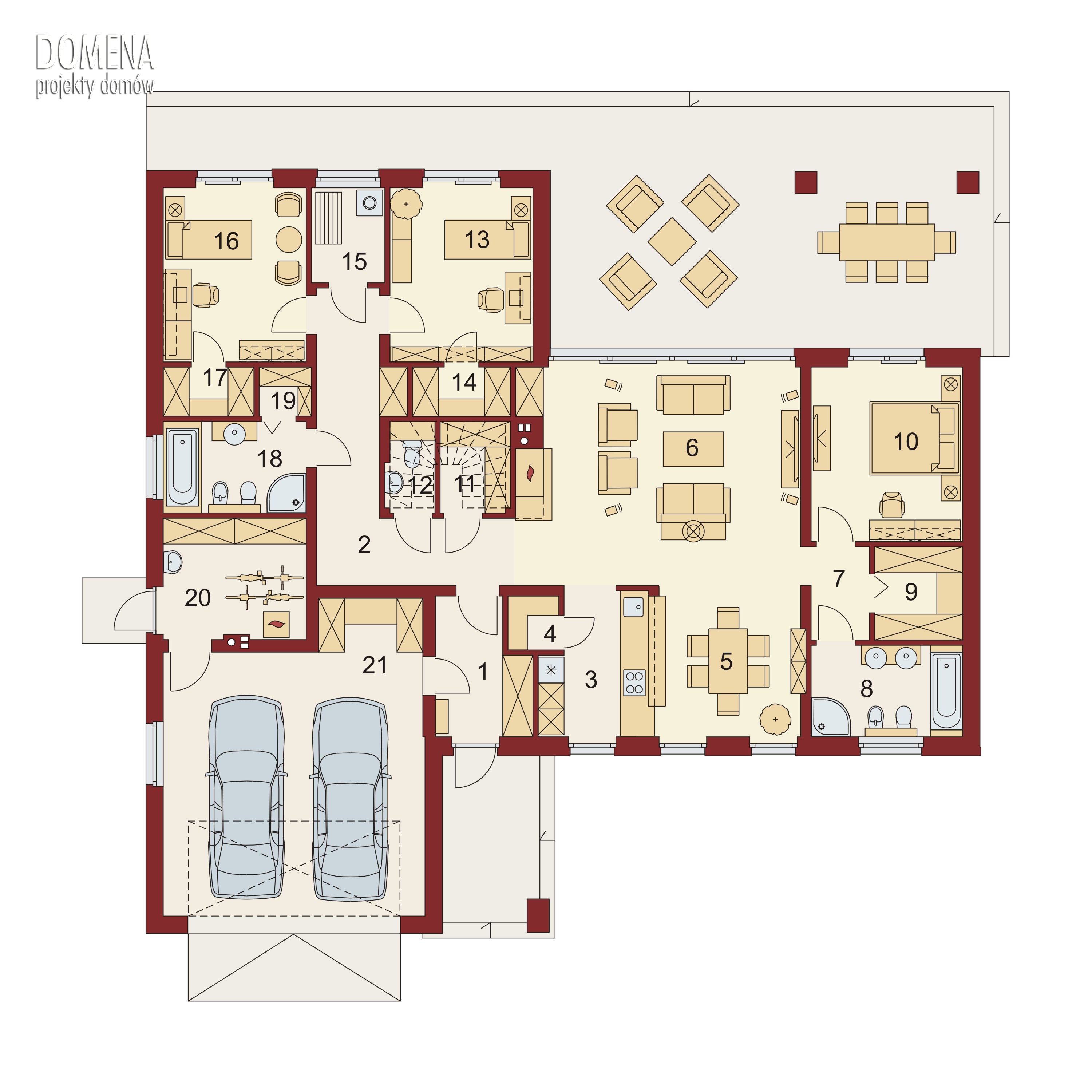 GEORGINA 2 PS to nowoczesny dom parterowy, który zaspokoi wszelkie wymagania 4-5 osób. Przemyślne usytuowanie przedsionka zapewnia jednoczesny dostęp do garażu, części dziennej i nocnej budynku, a w razie potrzeby także poddasza zaadaptowanego na cele mieszkalne. Oddzieloną barkiem kuchnię i jadalnię oraz przestronny salon, można w razie potrzeby wydzielić jako osobne pomieszczenia ze względu na ich doskonałe doświetlenie. Ekskluzywne rozwiązanie w postaci wydzielenia strefy głównej sypialni z własną łazienką i garderobą, zapewnia bezpośredni dostęp do części dziennej oraz zadaszonego tarasu. Przy przejściu do zacisznej części nocnej znajduje się toaleta i podręczne schowki, za którymi znajdują się dwie obszerne sypialnie z własnymi garderobami oraz łazienka z wydzielonym pomieszczeniem pomocniczym. Układ funkcjonalny dopełnia duży, wygodny garaż z aneksem magazynowym i przejściem do obszernego pomieszczenia gospodarczego, wyposażonego w praktyczne wyjście do ogrodu.