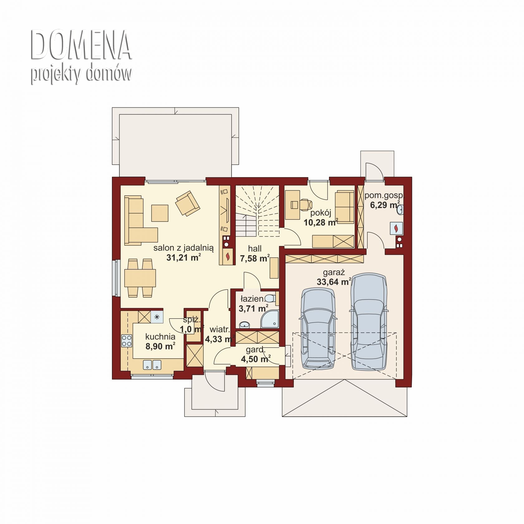 GERARD 2 to nowoczesny dom parterowy z poddaszem użytkowym, zaprojektowany z myślą o 4-5-osobowej rodzinie. Przedsionek z miejscem na szafę zapewnia dostęp jednocześnie do strefy dziennej i gospodarczej. Strefa dzienna, w której uwagę zwraca doskonale wyeksponowany kominek, składa się z przestronnego salonu połączonego z jadalnią, wydzielonej kuchni (którą można z łatwością połączyć z resztą wnętrza), spiżarni, łazienki oraz dodatkowego pokoju. Praktyczne pomieszczenie gospodarcze łączy przedsionek z garażem z dwoma stanowiskami postojowymi oraz dużym zapasem miejsca do przechowywania wzdłuż jego tylnej ściany. Za nią znajduje się pomieszczenie gospodarcze (kotłownia) z wyjściem do ogrodu. Na poddaszu znajdują się trzy sypialnie – każda z własną garderobą, główna dodatkowo z własną, bogato wyposażoną łazienką, oraz ogólnodostępny salon kąpielowy z przejściem do osobnego pomieszczenia pralni.