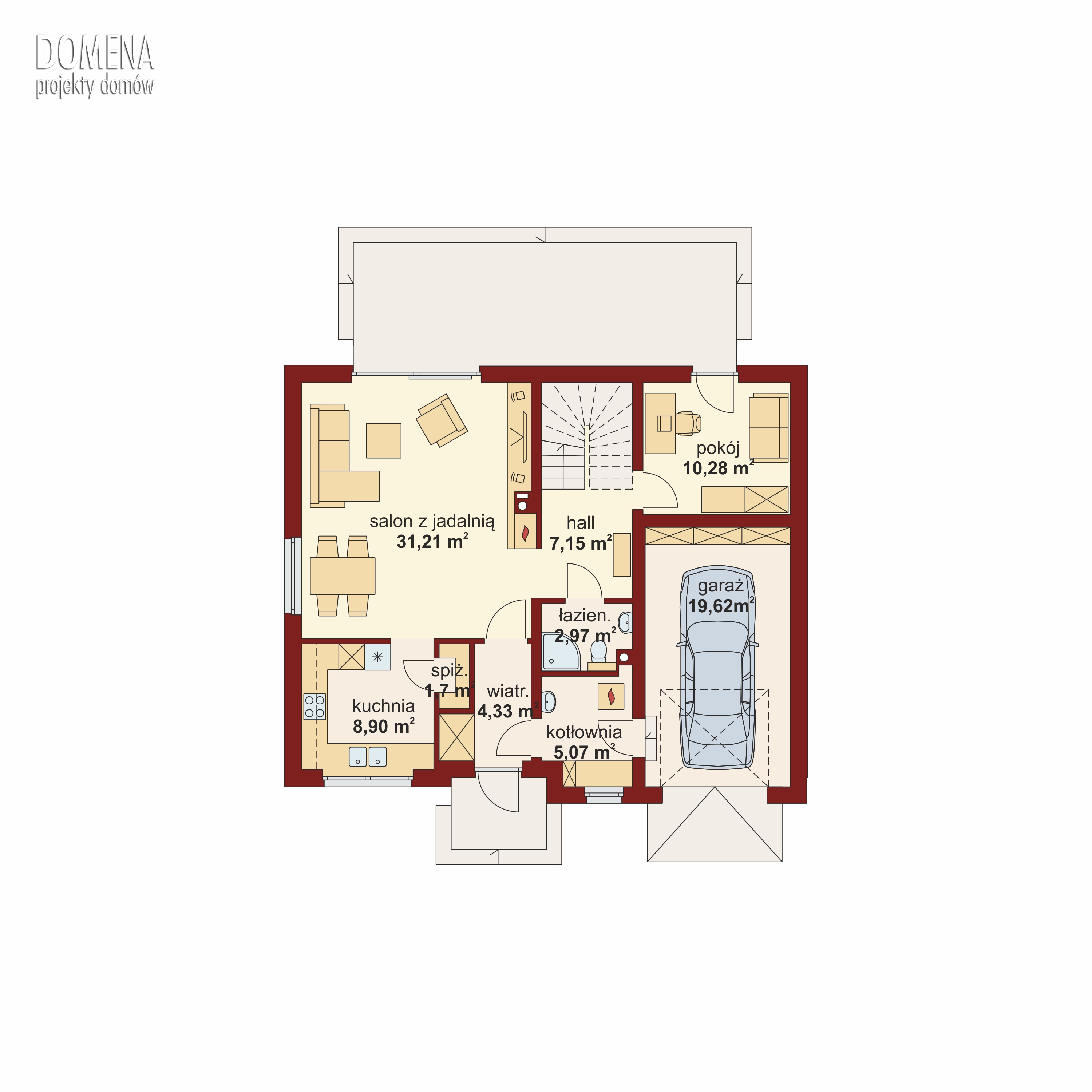 GERARD to nowoczesny dom parterowy z poddaszem użytkowym, zaprojektowany z myślą o 4-5-osobowej rodzinie. Przedsionek z miejscem na szafę zapewnia dostęp jednocześnie do strefy dziennej i gospodarczej. Strefa dzienna, w której uwagę zwraca doskonale wyeksponowany kominek, składa się z przestronnego salonu połączonego z jadalnią oraz wydzielonej kuchni (którą można z łatwością połączyć z resztą wnętrza). Pełnię funkcjonalności zapewnia spiżarnia, łazienka i dodatkowy pokój, który może pełnić funkcje gabinetu, pokoju gościnnego lub dodatkowej sypialni. Pomieszczenie gospodarcze wyposażone jest w praktycznie przejście do jednostanowiskowego garażu.