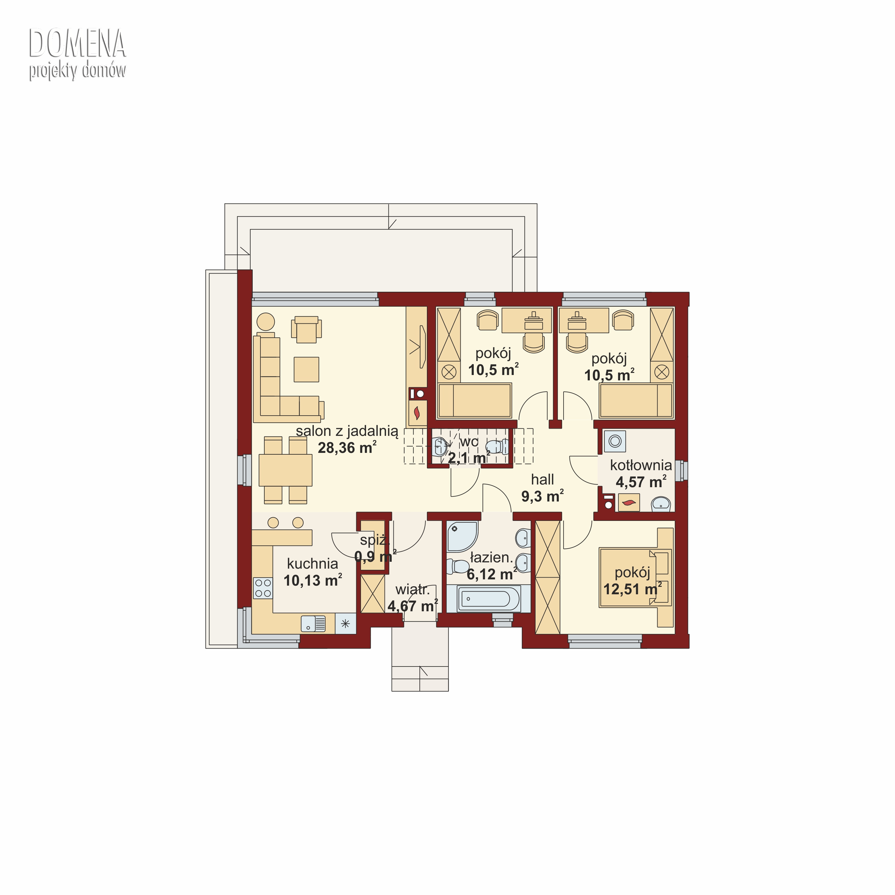Gorgiasz 3 to atrakcyjny nowoczesny dom dla 4-5-osobowej rodziny. Jednocześnie posiada on klasyczny prosty rzut, co ma bardzo korzystny wpływ na oszczędność związaną z ogrzewaniem domu oraz samą jego budową. Budynek posiada wyraźny podział na strefy: dzienną, nocną i gospodarczą. Zaraz po przekroczeniu wiatrołapu ukazuje się pierwsza z nich – połączony z jadalnią salon z szerokim widokiem na taras przekryty komfortową pergolą. Jadalnia płynnie przechodzi w kuchnię, którą po dostawieniu ścianki działowej możemy przekształcić w zamkniętą. Zaprojektowano także dostępną od strony kuchni spiżarnię. Większą przestrzeń na szafy w wiatrołapie można uzyskać decydując się na jej likwidację. Część nocną stanowią trzy sypialnie, jasna łazienka oraz toaleta. Istnieje możliwość przekształcenia poddasza w przestrzeń użytkową. Po usytuowaniu schodów w miejscu toalety, na poddaszu powstaje przestrzeń na dodatkową sypialnię czy pokój hobby.