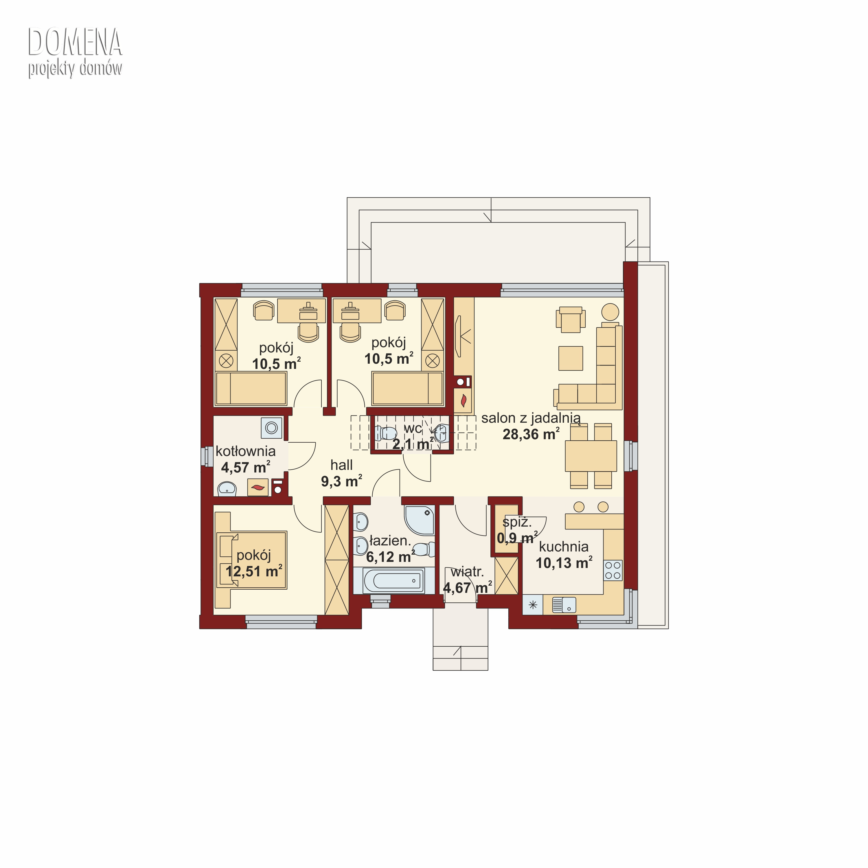 Gorgiasz 3 to atrakcyjny nowoczesny dom dla 4-5-osobowej rodziny. Jednocześnie posiada on klasyczny prosty rzut, co ma bardzo korzystny wpływ na oszczędność związaną z ogrzewaniem domu oraz samą jego budową. Budynek posiada wyraźny podział na strefy: dzienną, nocną i gospodarczą. Zaraz po przekroczeniu wiatrołapu ukazuje się pierwsza z nich – połączony z jadalnią salon z szerokim widokiem na taras przekryty komfortową pergolą. Jadalnia płynnie przechodzi w kuchnię, którą po dostawieniu ścianki działowej możemy przekształcić w zamkniętą. Zaprojektowano także dostępną od strony kuchni spiżarnię. Większą przestrzeń na szafy w wiatrołapie można uzyskać decydując się na jej likwidację. Część nocną stanowią trzy sypialnie, jasna łazienka oraz toaleta. Istnieje możliwość przekształcenia poddasza w przestrzeń użytkową. Po usytuowaniu schodów w miejscu toalety, na poddaszu powstaje przestrzeń na dodatkową sypialnię czy pokój hobby.