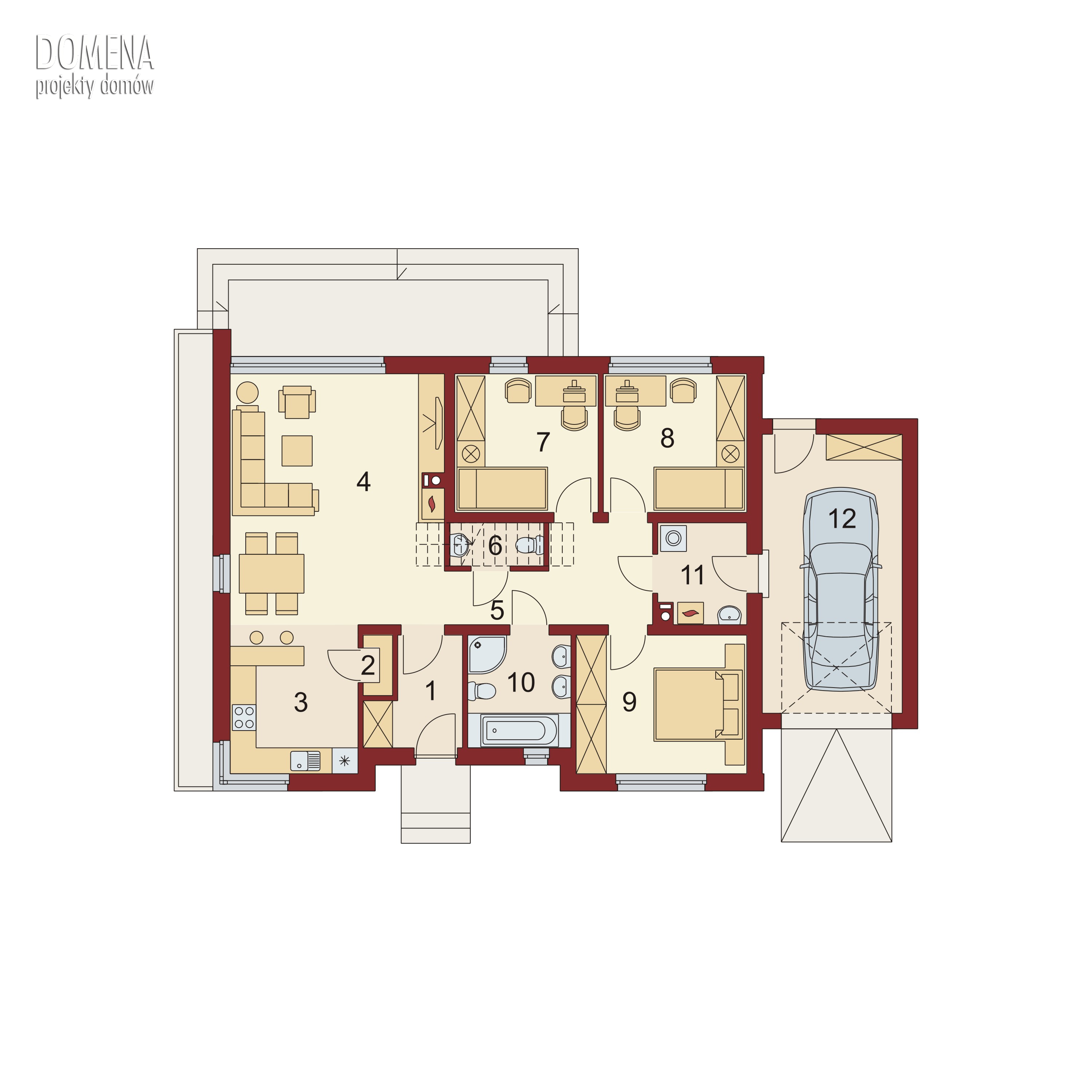 Gorgiasz to atrakcyjny nowoczesny dom dla 4-5-osobowej rodziny. Jednocześnie posiada on klasyczny prosty rzut, co ma bardzo korzystny wpływ na oszczędność związaną z ogrzewaniem domu oraz samą jego budową. Budynek posiada wyraźny podział na strefy: dzienną, nocną i gospodarczą. Zaraz po przekroczeniu wiatrołapu ukazuje się pierwsza z nich – połączony z jadalnią salon z szerokim widokiem na taras przekryty komfortową pergolą. Jadalnia płynnie przechodzi w kuchnię, którą po dostawieniu ścianki działowej możemy przekształcić w zamkniętą. Zaprojektowano także dostępną od strony kuchni spiżarnię. Większą przestrzeń na szafy w wiatrołapie można uzyskać decydując się na jej likwidację. Część nocną stanowią trzy sypialnie, jasna łazienka oraz toaleta. Garaż posiada wygodne wyjście na tyły budynku i bezpośrednie przejście przez kotłownie do części mieszkalnej budynku. Istnieje możliwość przekształcenia poddasza w przestrzeń użytkową. Po usytuowaniu schodów w miejscu toalety, na poddaszu powstaje przestrzeń na dodatkową sypialnię czy pokój hobby.