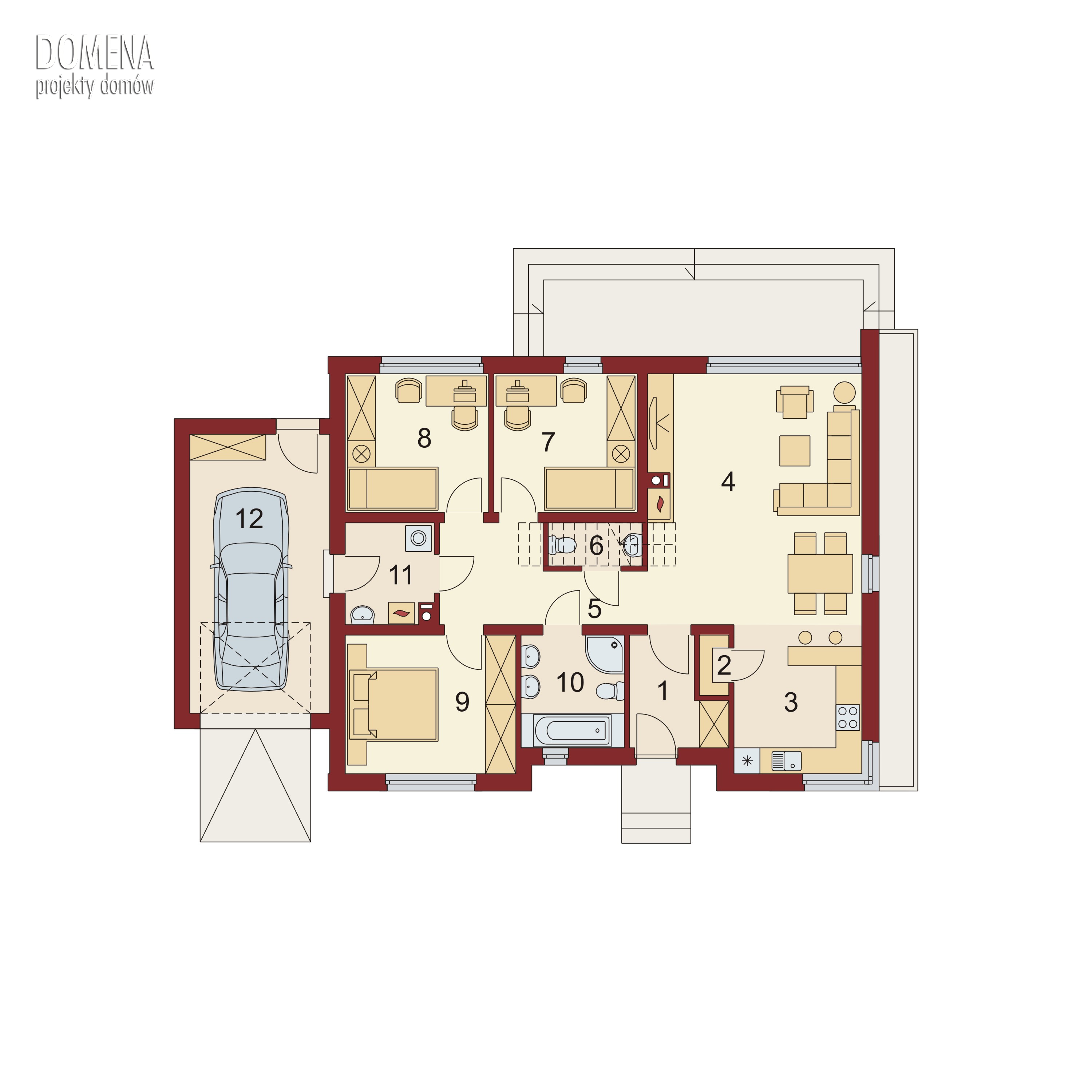 Gorgiasz to atrakcyjny nowoczesny dom dla 4-5-osobowej rodziny. Jednocześnie posiada on klasyczny prosty rzut, co ma bardzo korzystny wpływ na oszczędność związaną z ogrzewaniem domu oraz samą jego budową. Budynek posiada wyraźny podział na strefy: dzienną, nocną i gospodarczą. Zaraz po przekroczeniu wiatrołapu ukazuje się pierwsza z nich – połączony z jadalnią salon z szerokim widokiem na taras przekryty komfortową pergolą. Jadalnia płynnie przechodzi w kuchnię, którą po dostawieniu ścianki działowej możemy przekształcić w zamkniętą. Zaprojektowano także dostępną od strony kuchni spiżarnię. Większą przestrzeń na szafy w wiatrołapie można uzyskać decydując się na jej likwidację. Część nocną stanowią trzy sypialnie, jasna łazienka oraz toaleta. Garaż posiada wygodne wyjście na tyły budynku i bezpośrednie przejście przez kotłownie do części mieszkalnej budynku. Istnieje możliwość przekształcenia poddasza w przestrzeń użytkową. Po usytuowaniu schodów w miejscu toalety, na poddaszu powstaje przestrzeń na dodatkową sypialnię czy pokój hobby.