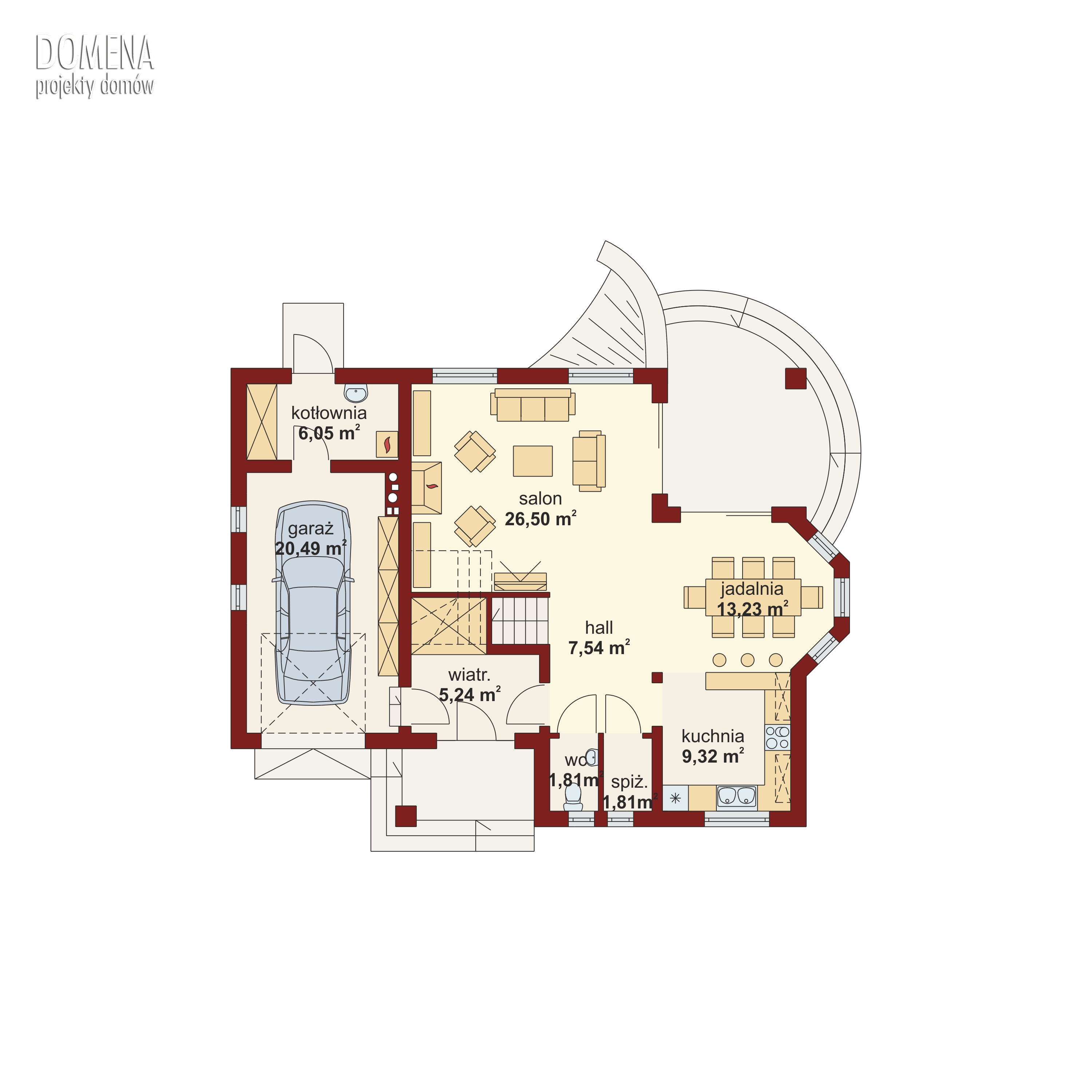 Hektor, to ekonomiczny dom dla 4 osobowej rodziny zaprojektowany na planie prostokąta wzbogaconego o przeszklony wykusz, wcięcie tarasu oraz praktyczny podcień. Stanowiąca jednorodną przestrzeń część dzienna na parterze mieści salon z kominkiem, umiejscowioną w wykuszu jadalnię i kuchnię z barkiem. Wykorzystując słup kuchnię można zamknąć ścianką działową tworząc odrębne pomieszczenie. Obok kuchni znajduje się spiżarnia, a za nią pomieszczenie wc. Można zrezygnować ze spiżarki powiększając wc i projektując tam łazienkę. W części gospodarczej parteru mamy jednostanowiskowy garaż z miejscem na ciąg praktycznych regałów, czy szaf oraz pomieszczenie gospodarcze/kotłownię z wyjściem od strony ogrodu. Poddasze, to strefa nocna, w której zaplanowano dwie sypialnie z garderobami i jedna z obszerną szafą wnękową oraz optymalnej wielkości łazienkę. Nieużytkową w projekcie przestrzeń strychu można zaadaptować na pokój hobby, czy zabaw dla dzieci.