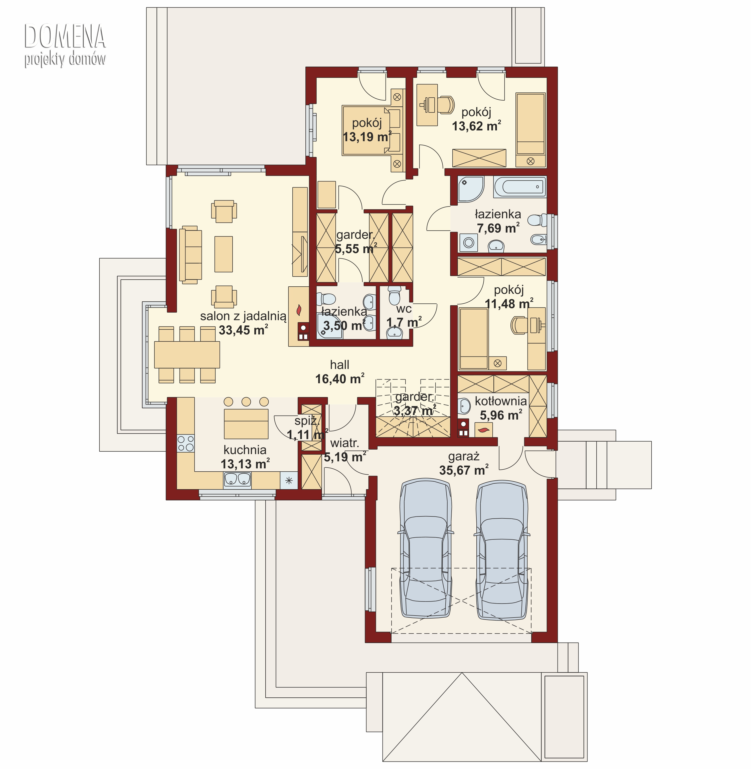 Nowoczesna bryła, dobre nasłonecznienie, funkcjonalne rozwiązania – to cechy charakterystyczne Heraklesa. Czytelny podział domu na strefy: dzienną i nocną. Część dzienna to duża, bardzo jasna otwarta przestrzeń z bezpośrednim wyjściem na taras i centralnie położonym kominkiem. Interesującym rozwiązaniem jest przeszklony wykusz, w który idealnie wpisuje się stół jadalni, stanowiącej łącznik między salonem a obszerną kuchnią. Ta ostatnia, po wydzieleniu jej ściankami działowymi, może również funkcjonować jako kuchnia zamknięta. Ma ona także dostęp do poręcznej spiżarki. Na strefę nocną składa się sypialnia rodziców z indywidualną garderobą i łazienką oraz możliwością wyjścia na taras, a także dwa pokoje dzieci z usytuowaną pomiędzy nimi dużą łazienką. Jeden z pokoi, z racji swojej bliskości do strefy wejściowej, może być wykorzystany na np. gabinet. Nisza w hallu może być miejscem na pakowną szafę wnękową, bądź schody prowadzące na poddasze, które może być zaadaptowane na użytkowe. Dzięki niemu możemy skutecznie powiększyć dom np. o dodatkową sypialnię, czy pokój hobby.