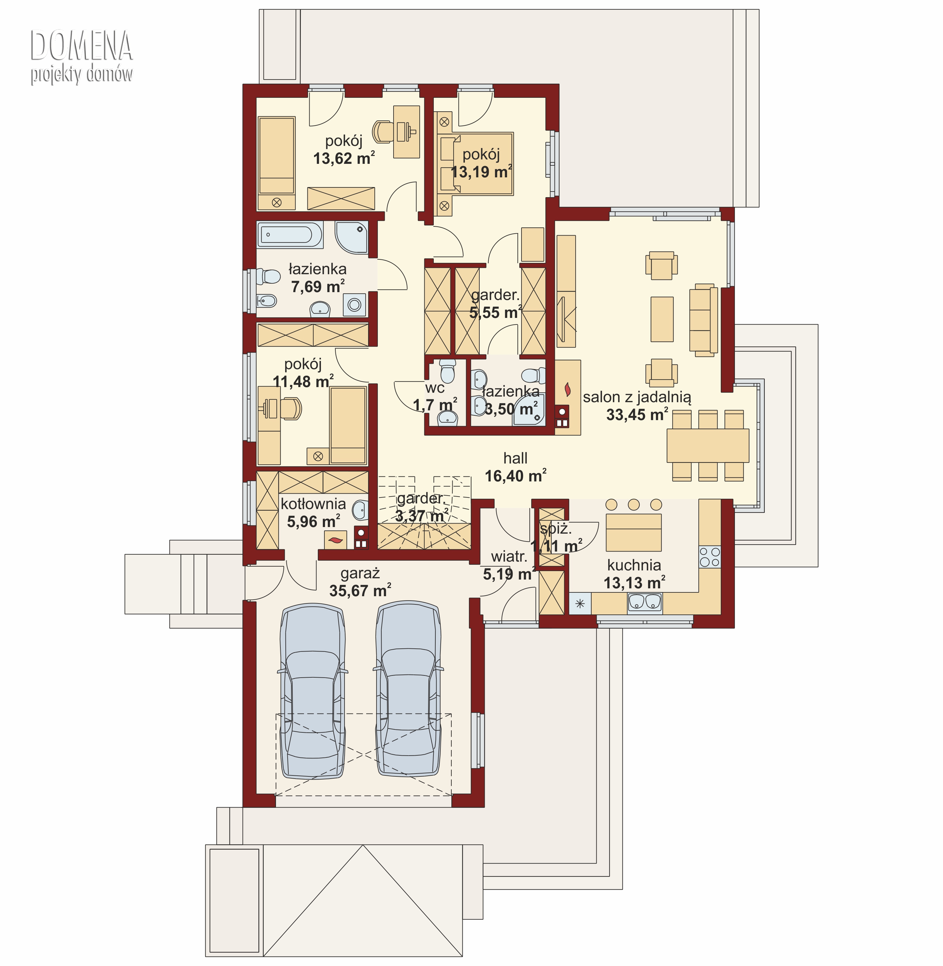 Proszę spojrzeć na projekt DOMENA 101A - podobny układ, strop Teriva https://www.domenadom.pl/produkty/381/domena-101-a-.html