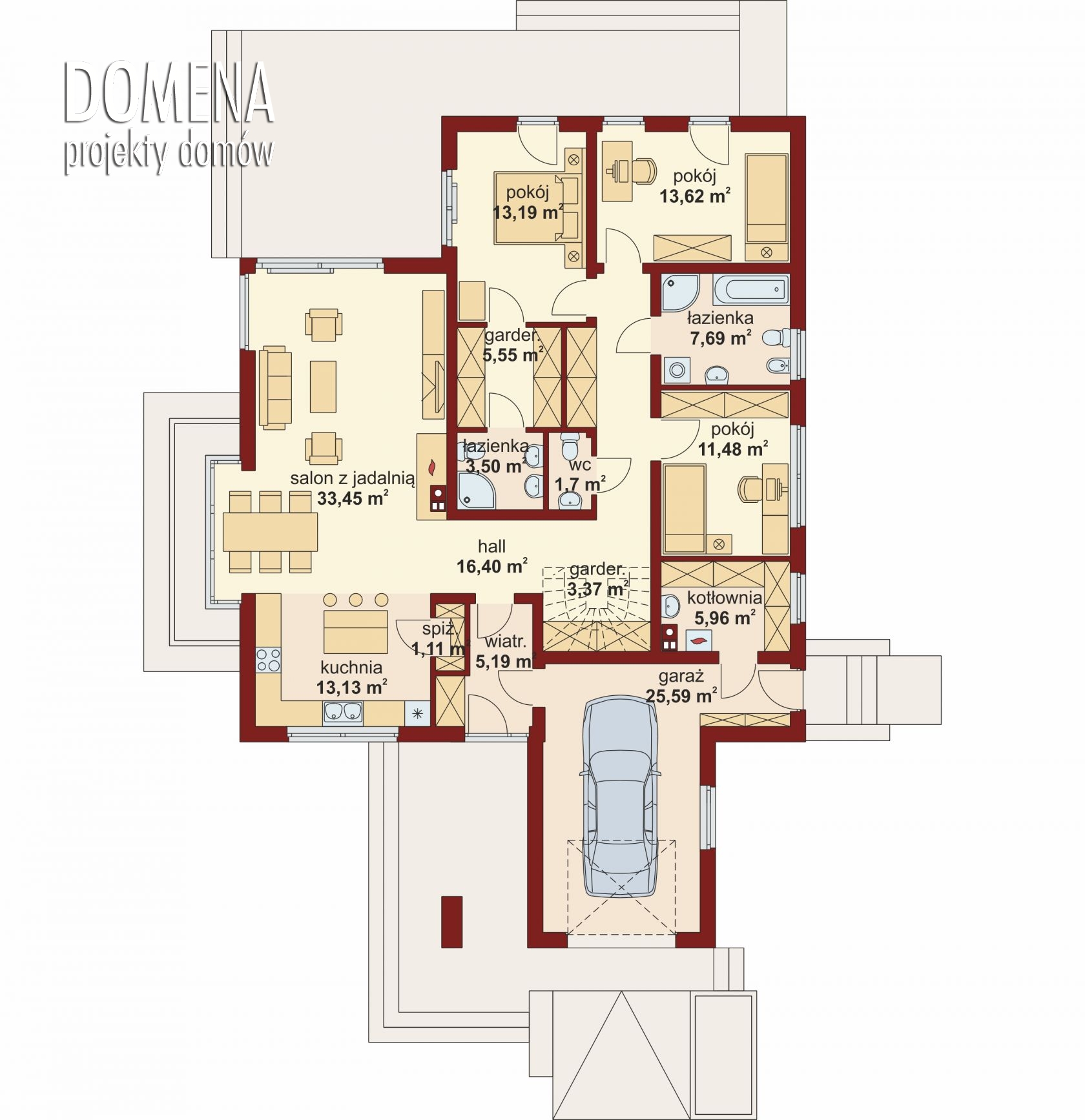Nowoczesna bryła, dobre nasłonecznienie, funkcjonalne rozwiązania – to cechy charakterystyczne Heraklesa. Czytelny podział domu na strefy: dzienną i nocną. Część dzienna to duża, bardzo jasna otwarta przestrzeń z bezpośrednim wyjściem na taras i centralnie położonym kominkiem. Interesującym rozwiązaniem jest przeszklony wykusz, w który idealnie wpisuje się stół jadalni, stanowiącej łącznik między salonem a obszerną kuchnią. Ta ostatnia, po wydzieleniu jej ściankami działowymi, może również funkcjonować jako kuchnia zamknięta. Ma ona także dostęp do poręcznej spiżarki. Na strefę nocną składa się sypialnia rodziców z indywidualną garderobą i łazienką oraz możliwością wyjścia na taras, a także dwa pokoje dzieci z usytuowaną pomiędzy nimi dużą łazienką. Jeden z pokoi, z racji swojej bliskości do strefy wejściowej, może być wykorzystany na np. gabinet. Nisza w hallu może być miejscem na pakowną szafę wnękową, bądź schody prowadzące na poddasze, które może być zaadaptowane na użytkowe. Dzięki niemu możemy skutecznie powiększyć dom np. o dodatkową sypialnię, czy pokój hobby.
