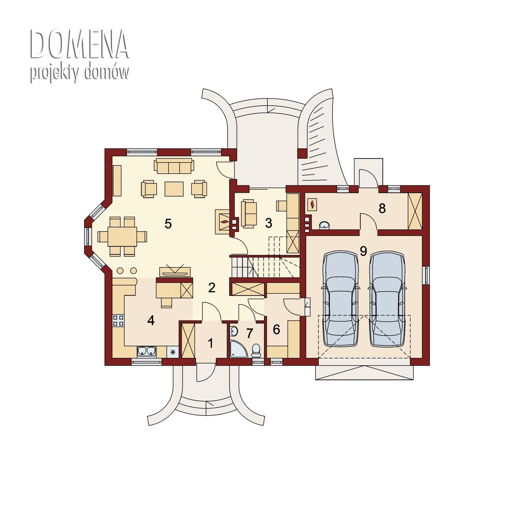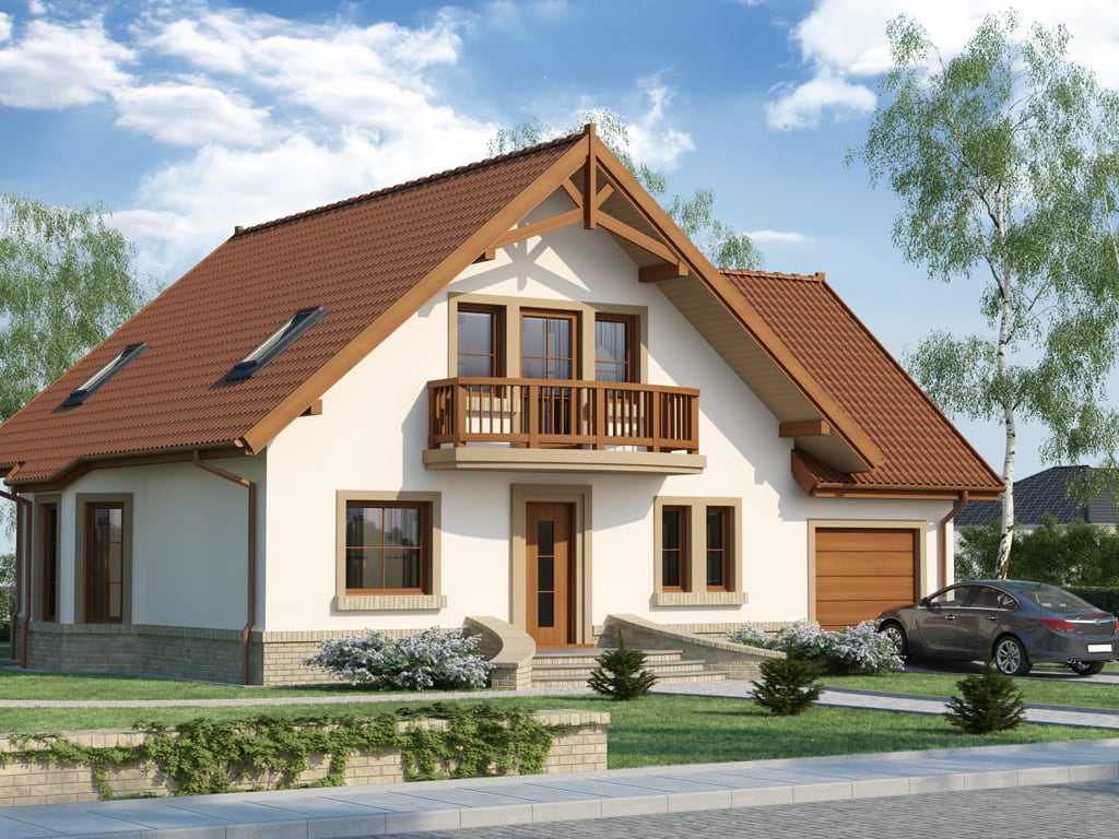 Hermes 2 - G2 to komfortowy dom przeznaczony dla 4-5 osobowej rodziny, z funkcjonalnym rozwiązaniem układu wnętrza, podzielonego na zlokalizowaną w obrębie parteru strefę dzienną i wyodrębnioną na poddaszu – strefą nocną. Na parterze znajdują się: przestronna kuchnia którą z łatwością można wydzielić ściankami działowymi, osadzona w wykuszu jadalnia, pokaźnych rozmiarów pokój dzienny, gabinet który z łatwością można zaadaptować na dodatkową sypialnię dla gości, zlokalizowana obok wiatrołapu wygodna łazienka oraz w części gospodarczej – spiżarnia przez którą dojść można do dwustanowiskowego garażu i pomieszczenia gospodarczego pełniącego również funkcję kotłowni. Na poddaszu wygospodarowano dwa ustawne pokoje połączone wspólnym balkonem, pojemną garderobę dostępną z przestrzeni komunikacji i dwuosobową sypialnię z własnym balkonem, sąsiadującą z dużym salonem kąpielowym. W zależności od indywidualnych potrzeb - powierzchnię użytkową domu można dodatkowo zwiększyć przekształcając zlokalizowany nad garażem strych na pokój hobby czy siłownię -korzystając z zaprojektowanego doświetlenia tego pomieszczenia oknami połaciowymi i oknem w ścianie szczytowej. Możliwe jest również proste wydzielenie tam niezależnego pomieszczenia pralni. Ciepła kolorystyka materiałów zastosowanych na elewacji i nieskomplikowana bryła domu stanowią o jego uroku, a ekonomiczność zastosowanych rozwiązań konstrukcyjnych przemawia za jego wyborem.
