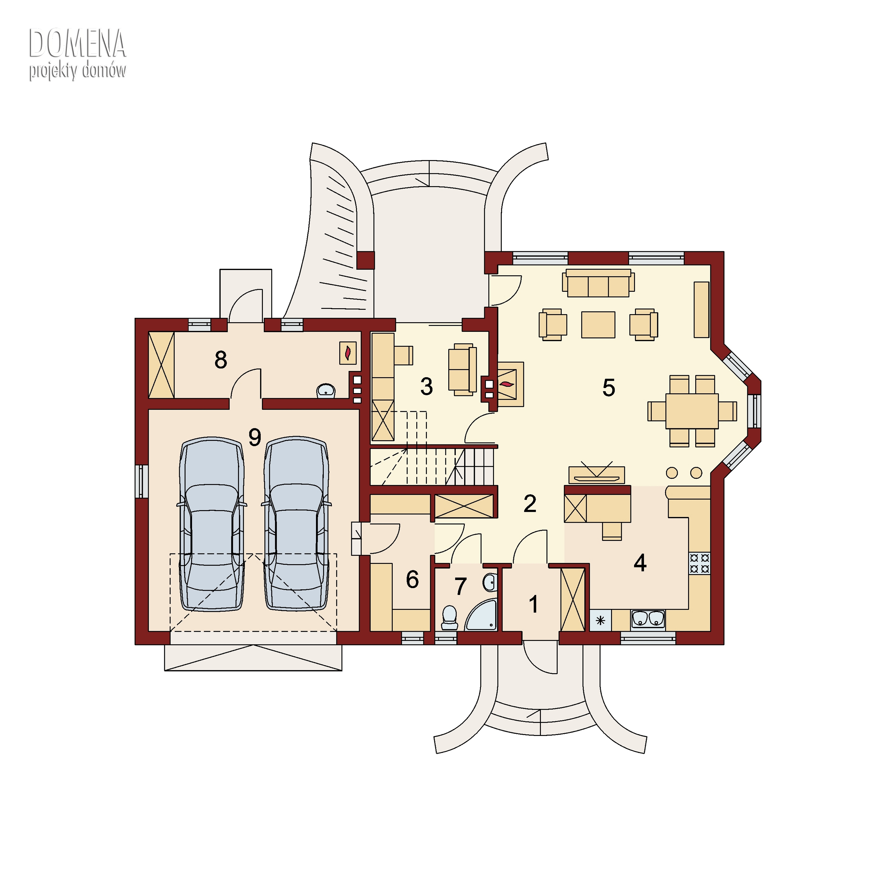 Hermes 2 - G2 to komfortowy dom przeznaczony dla 4-5 osobowej rodziny, z funkcjonalnym rozwiązaniem układu wnętrza, podzielonego na zlokalizowaną w obrębie parteru strefę dzienną i wyodrębnioną na poddaszu – strefą nocną. Na parterze znajdują się: przestronna kuchnia którą z łatwością można wydzielić ściankami działowymi, osadzona w wykuszu jadalnia, pokaźnych rozmiarów pokój dzienny, gabinet który z łatwością można zaadaptować na dodatkową sypialnię dla gości, zlokalizowana obok wiatrołapu wygodna łazienka oraz w części gospodarczej – spiżarnia przez którą dojść można do dwustanowiskowego garażu i pomieszczenia gospodarczego pełniącego również funkcję kotłowni. Na poddaszu wygospodarowano dwa ustawne pokoje połączone wspólnym balkonem, pojemną garderobę dostępną z przestrzeni komunikacji i dwuosobową sypialnię z własnym balkonem, sąsiadującą z dużym salonem kąpielowym. W zależności od indywidualnych potrzeb - powierzchnię użytkową domu można dodatkowo zwiększyć przekształcając zlokalizowany nad garażem strych na pokój hobby czy siłownię -korzystając z zaprojektowanego doświetlenia tego pomieszczenia oknami połaciowymi i oknem w ścianie szczytowej. Możliwe jest również proste wydzielenie tam niezależnego pomieszczenia pralni. Ciepła kolorystyka materiałów zastosowanych na elewacji i nieskomplikowana bryła domu stanowią o jego uroku, a ekonomiczność zastosowanych rozwiązań konstrukcyjnych przemawia za jego wyborem.