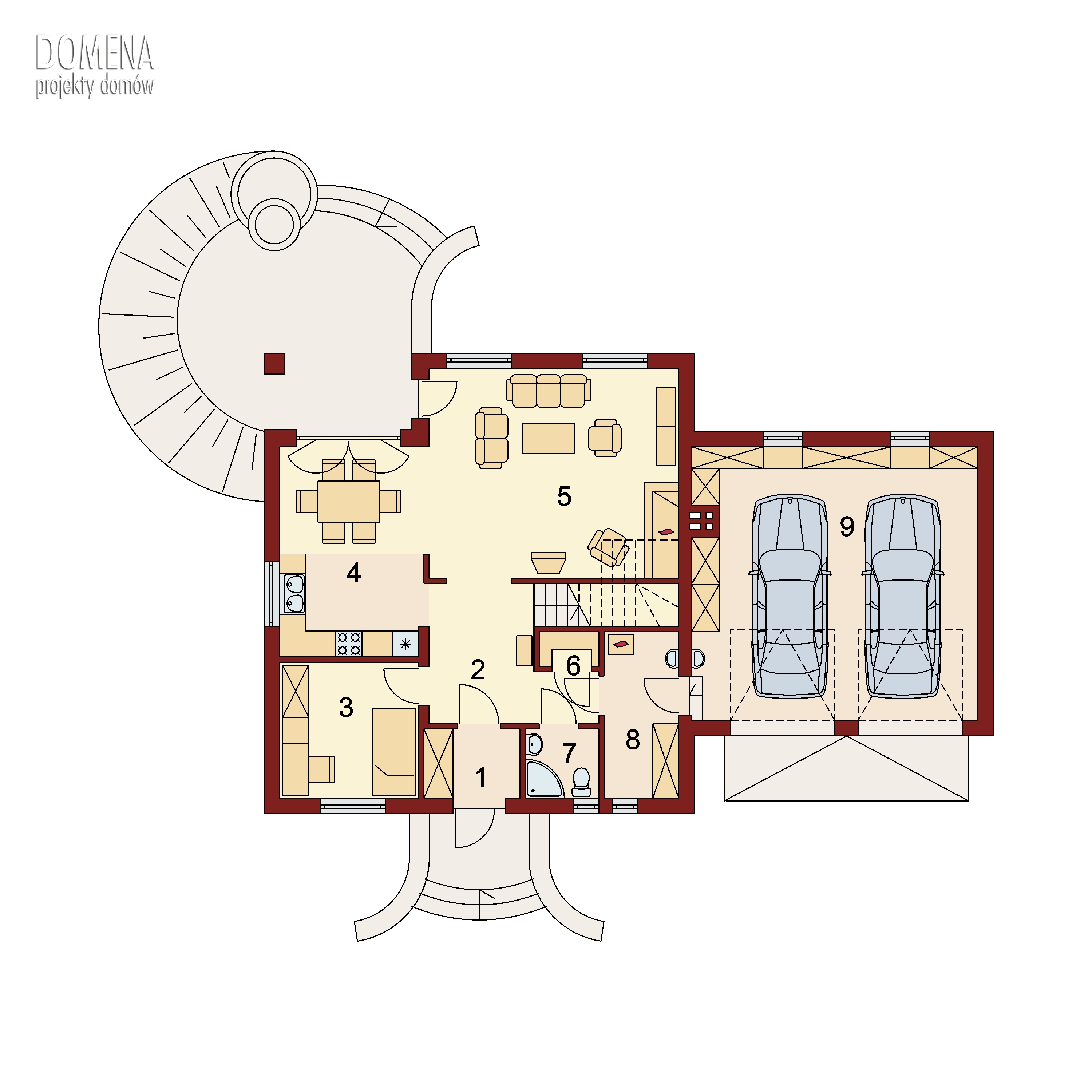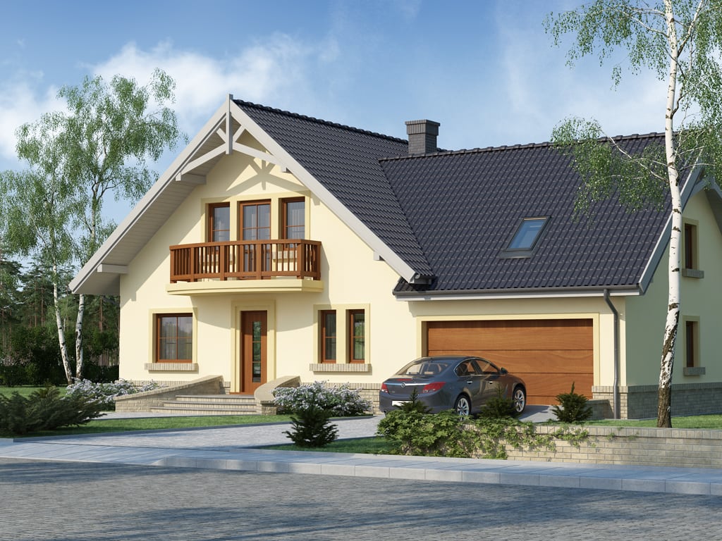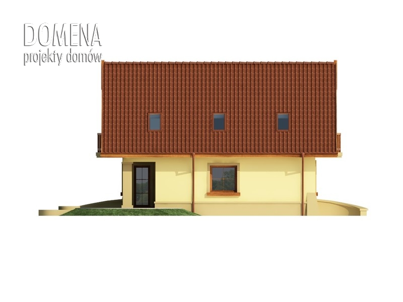 Dom z poddaszem użytkowym, przeznaczony dla 4-5-osobowej rodziny. Na parterze znajduje się przestronny pokój dzienny otwarty na jadalnię połączoną z kuchnią. Rozwiązanie funkcjonalne pozwala na wydzielenie ww. pomieszczeń. Wyjście na taras z podcieniem jest możliwe zarówno z jadalni jak i z pokoju dziennego. Na parterze znajduje się spiżarnia, łazienka oraz dodatkowy pokój, a także pomieszczenie gospodarcze, przez które można się dostać do przestronnego garażu, dającego możliwość zabudowania dwóch ścian szafami. Na poddaszu znajdują się trzy sypialnie, łazienka oraz garderoba. Hol na poddaszu posiada wnękę przeznaczoną na szafę. Nad garażem znajduje się dodatkowa łazienka, strych mogący spełniac rolę suszarni oraz pokój. W ramach adaptacji istnieje mozliwość powiększenia kuchni z jadalnią i tarasu w podcieniu oraz powiększenie i lokalizacja spiżarni bezpośrednio przy kuchni, kosztem dodatkowego pokoju na parterze. Dzięki prostym rozwiązaniom konstrukcyjnym i nieskomplikowanej bryle jest on niedrogi w budowie i eksploatacji. Projekt dostępny w lustrzanym odbiciu.