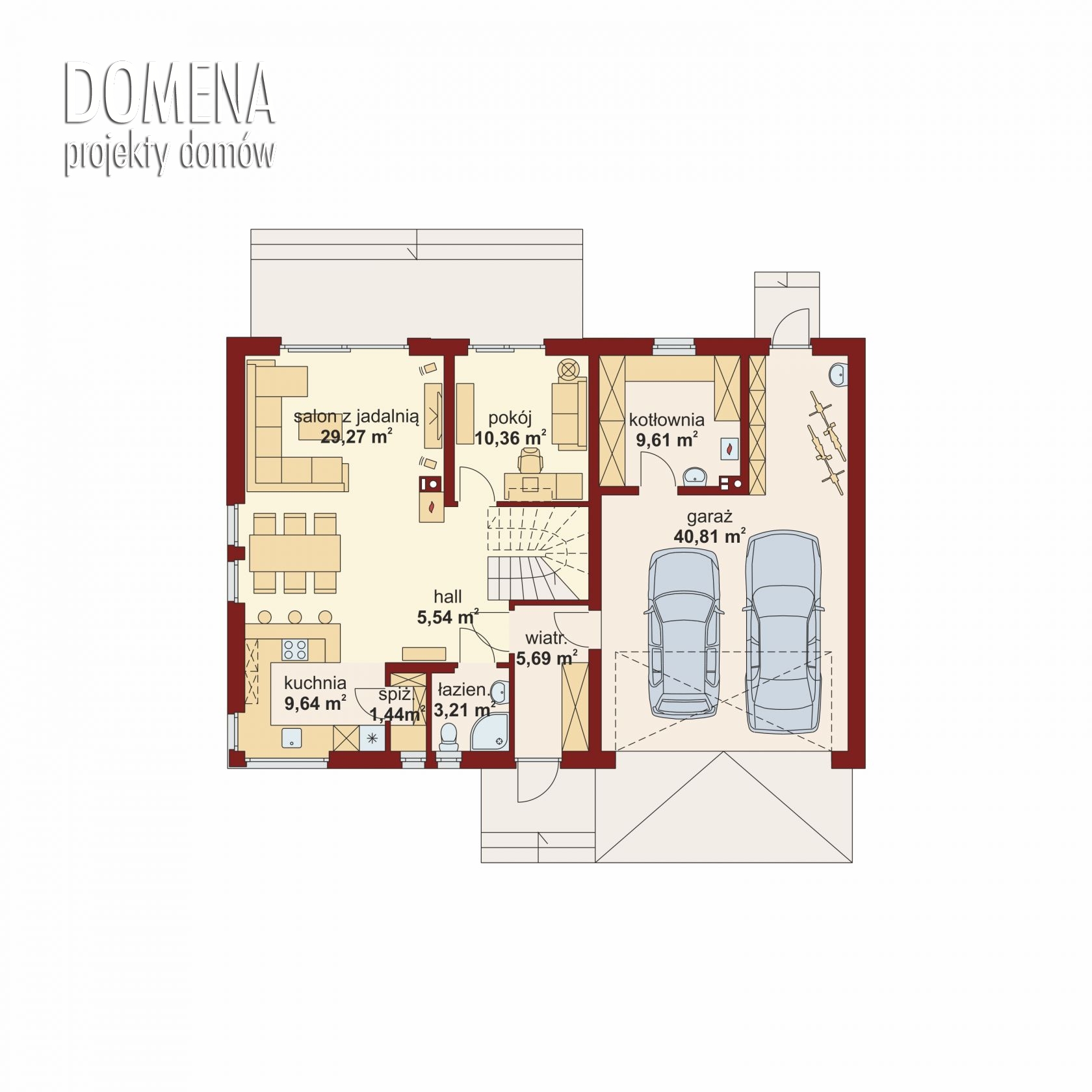 Przedsionek z miejscem na obszerną szafę zapewnia dostęp jednocześnie do strefy dziennej i gospodarczej. Strefa dzienna, w której uwagę zwraca doskonale wyeksponowany kominek, składa się z przestronnego salonu połączonego z jadalnią i otwartą kuchnią (którą można też oddzielić podczas adaptacji budynku). Funkcjonalność dopełnia spiżarnia, łatwo dostępna łazienka i dodatkowy pokój, mogący pełnić funkcje gabinetu, pokoju gościnnego lub dodatkowej sypialni. Strefa gospodarcza to dwustanowiskowy garaż z aneksem gospodarczym, wyposażonym w praktyczne wyjście do ogrodu, oraz duża kotłownia.