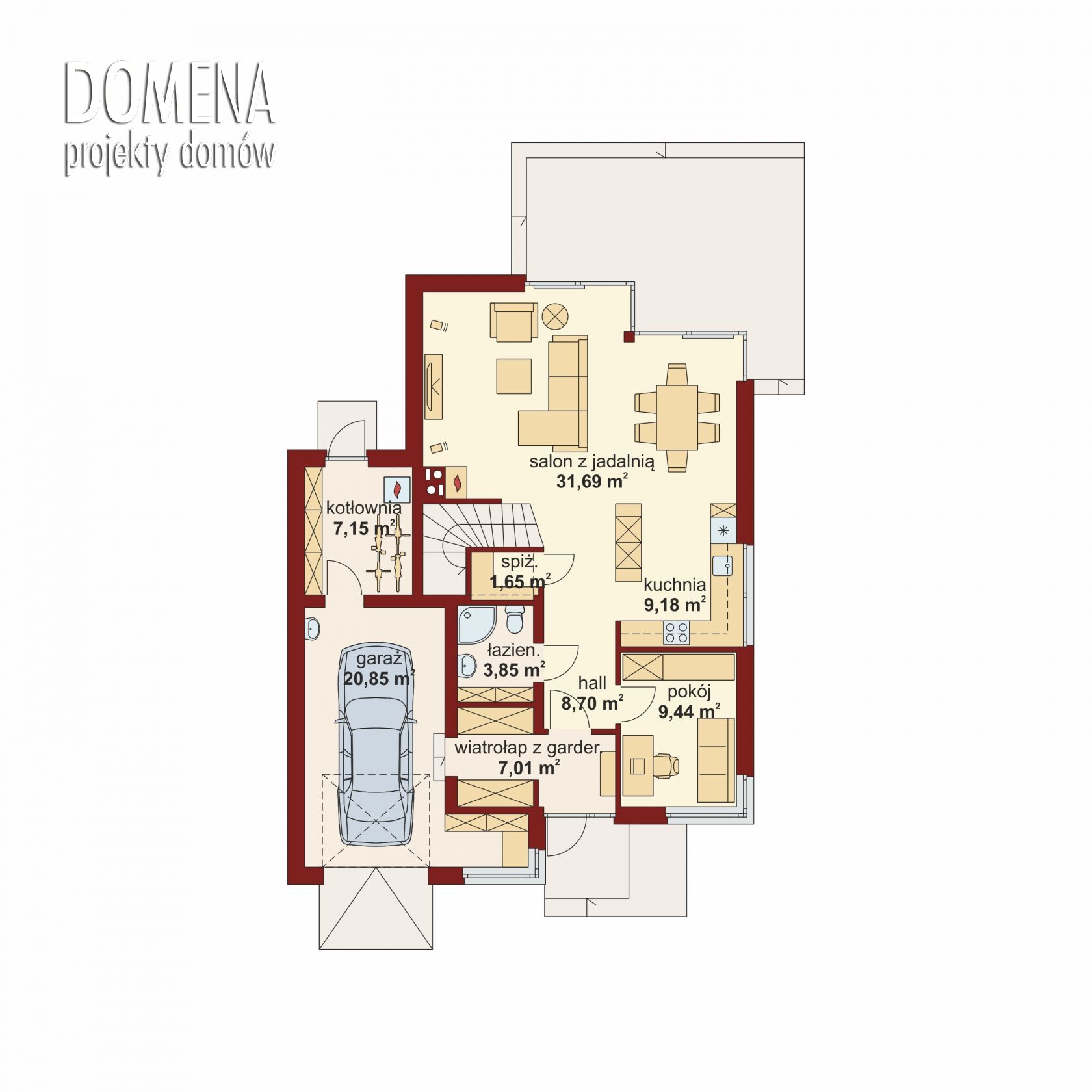 Istnieje taka możliwość, wiąże się to ze zwężeniem budynku o 80 cm w części gospodarczej. Garaż można wsunąć w dom kosztem części wiatrołapu oraz łazienki poprzez likwidację kabiny prysznicowej i pozostawienie tylko WC z umywalką. W przypadku kotłowni pozostaje zwężenie pomieszczenia, zostanie 170 cm.