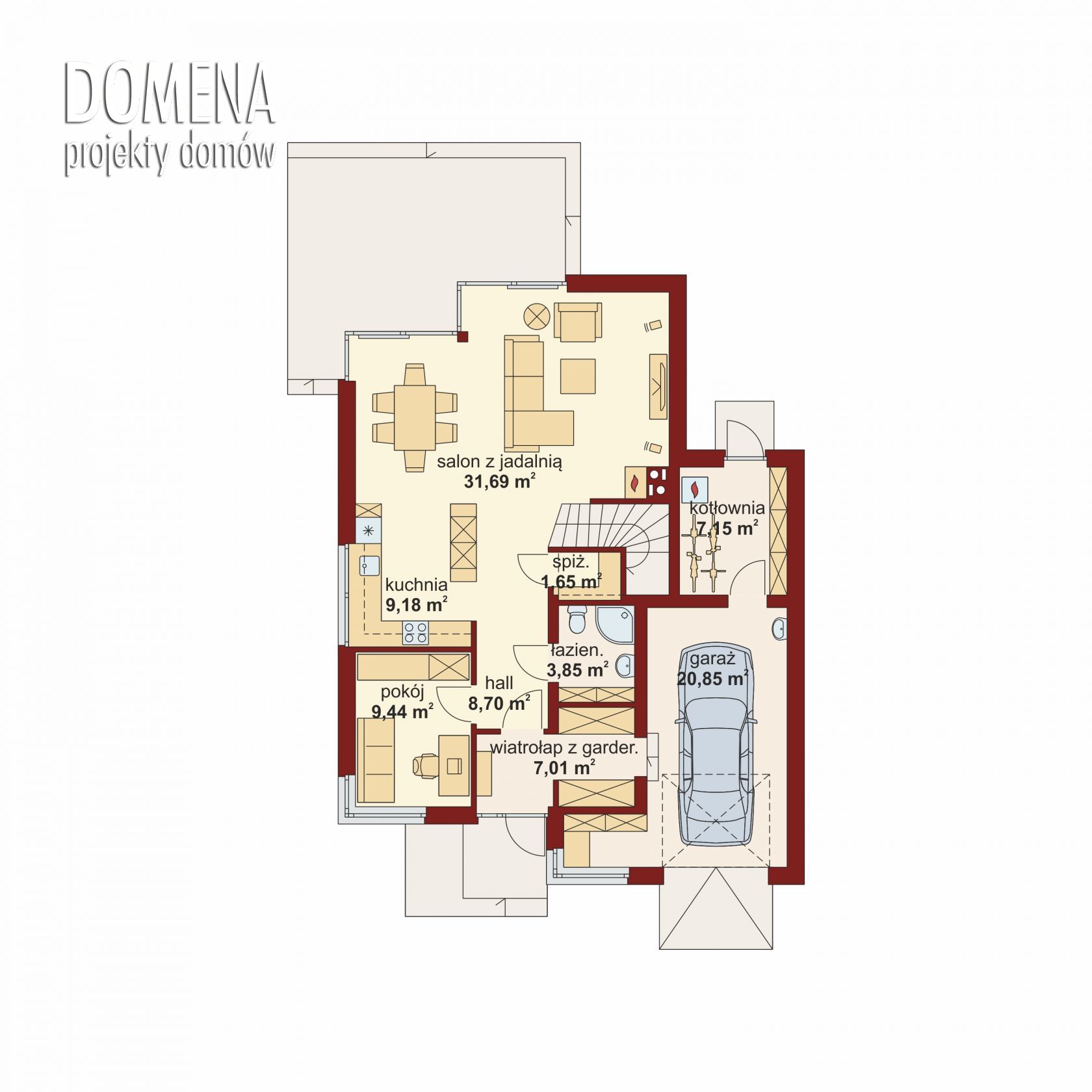 Istnieje taka możliwość, wiąże się to ze zwężeniem budynku o 80 cm w części gospodarczej. Garaż można wsunąć w dom kosztem części wiatrołapu oraz łazienki poprzez likwidację kabiny prysznicowej i pozostawienie tylko WC z umywalką. W przypadku kotłowni pozostaje zwężenie pomieszczenia, zostanie 170 cm.