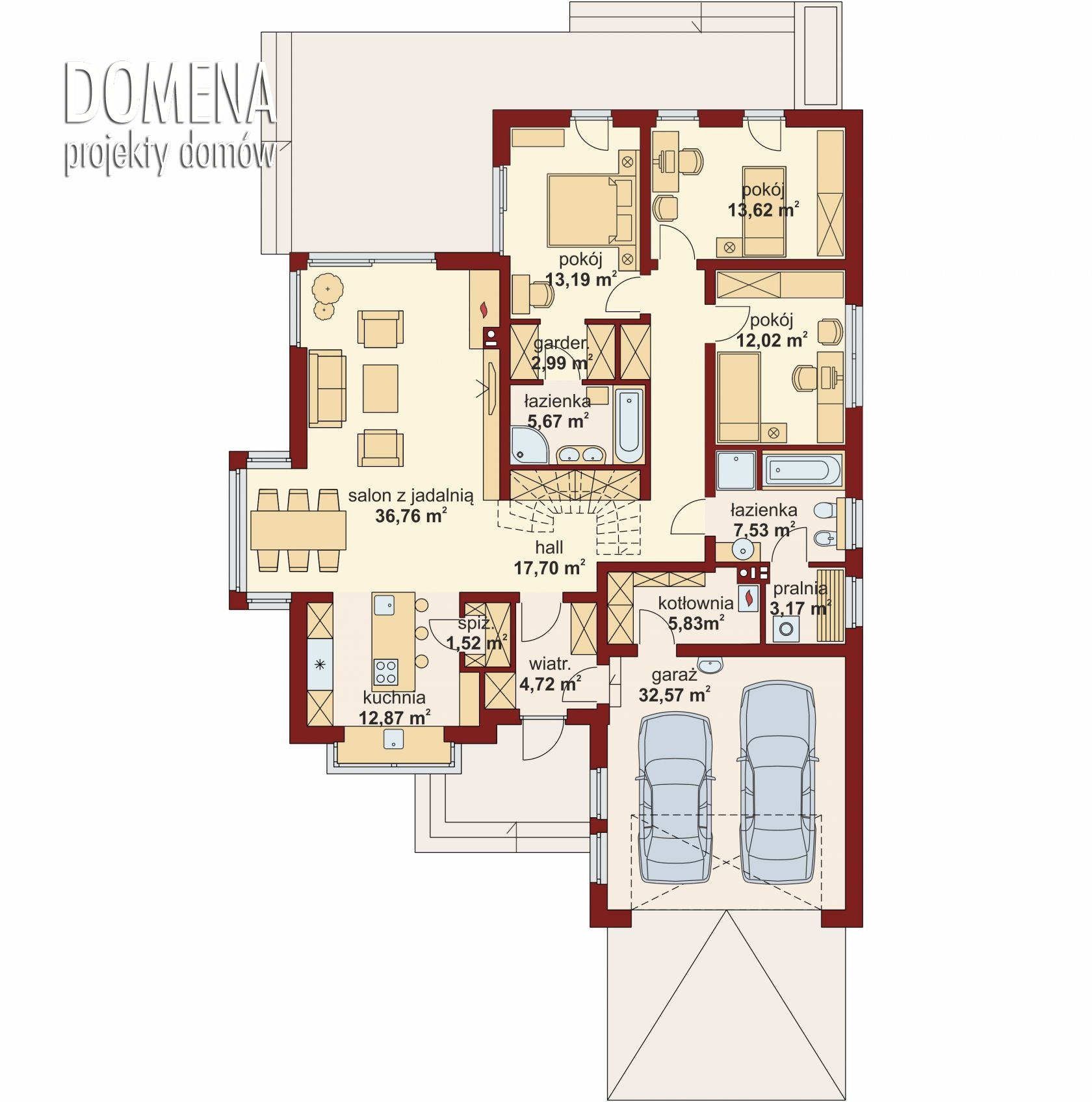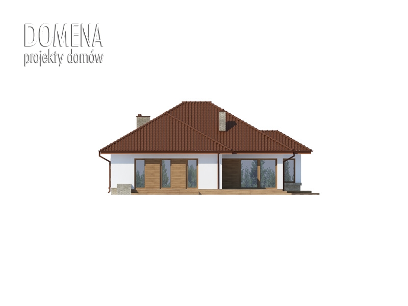 KASANDRA 2 to dom parterowy zaprojektowany dla rodziny 4-5-osobowej. Mimo nowoczesnej architektury, podkreślonej dużymi przeszkleniami i wykuszami, budynek sprawia wrażenie przytulnego i gościnnego. Po minięciu praktycznego podcienia przed głównym wejściem do domu, przechodząc przez wiatrołap, wkraczamy do strefy dziennej budynku. Stanowi ją otwarta przestrzeń, z której bez trudu wyodrębnić można salon z kominkiem, ograniczoną dużym przeszkleniem jadalnię oraz kuchnię. Szczególnie atrakcyjnie kształtuje się ta ostatnia, wyposażona w wyspę kuchenną, spiżarnię oraz blat roboczy umieszczony w ciekawy sposób w przeszklonym wykuszu. Można ją także prostymi środkami przekształcić, np. rezygnując ze spiżarni dostawić dodatkowy blat kuchenny, powiększając jednocześnie wiatrołap o miejsce dla szaf, czy dostawiając ściankę działową, z kuchni otwartej zrobić zamkniętą. W drugiej części domu mieści się strefa nocna. Składają się na nią trzy pokoje, w tym dwa z osobnym wyjściem na przestronny taras. Jedna z sypialni posiada indywidualną łazienkę oraz wydzieloną przestrzeń na szafy, kosztem której możemy powiększyć bądź łazienkę, bądź samą sypialnię. Przy ogólnodostępnej łazience znajduje się pralnia, z której rezygnując zyskujemy przestronny salon kąpielowy. Bezpośrednio z wiatrołapu dostępny jest dwustanowiskowy garaż z podręcznym przejściem do kotłowni. W hallu głównym, w przestrzeni oryginalnie przeznaczonej na szafy, można zamiennie usytuować schody, prowadzące na zaadaptowane na cele mieszkalne poddasze.