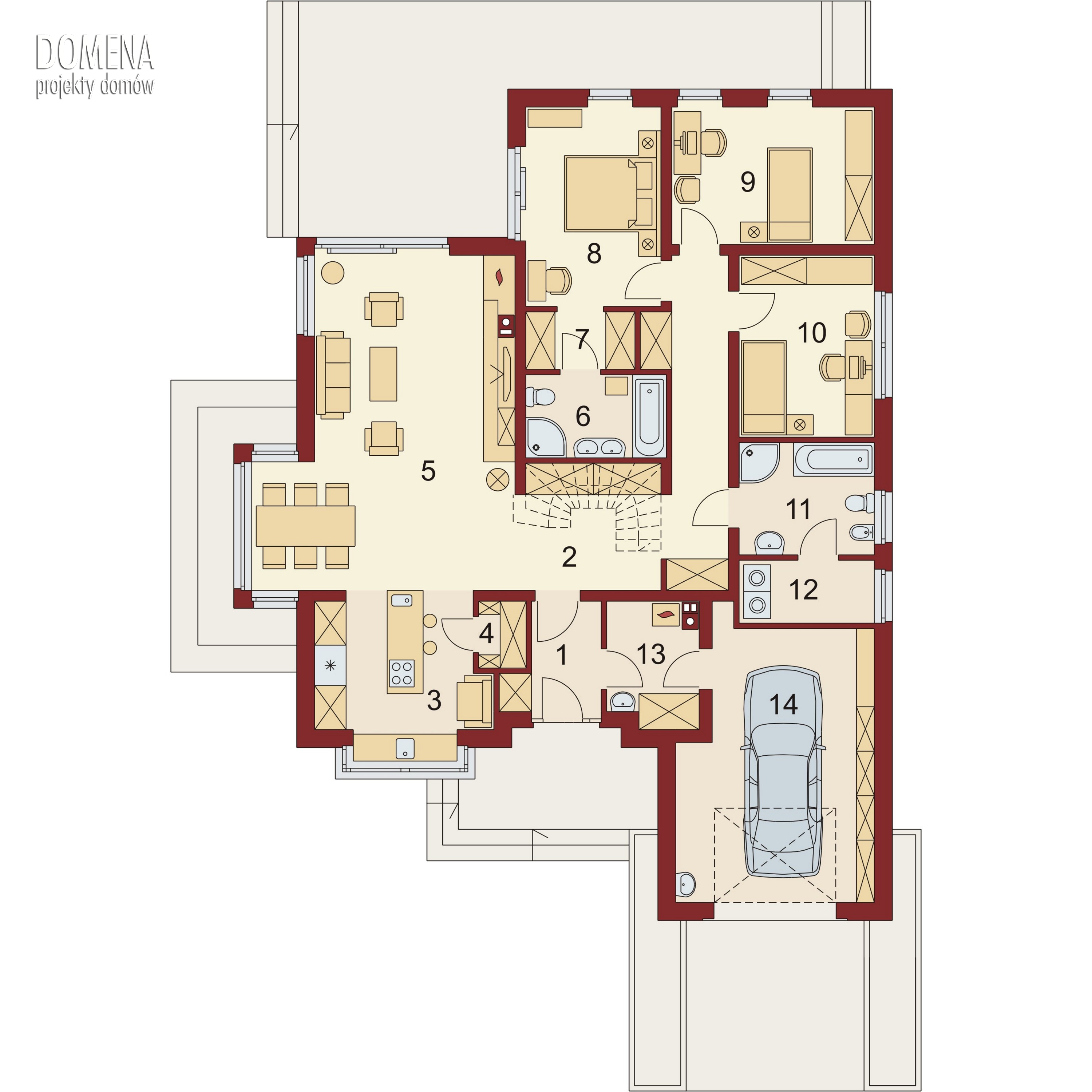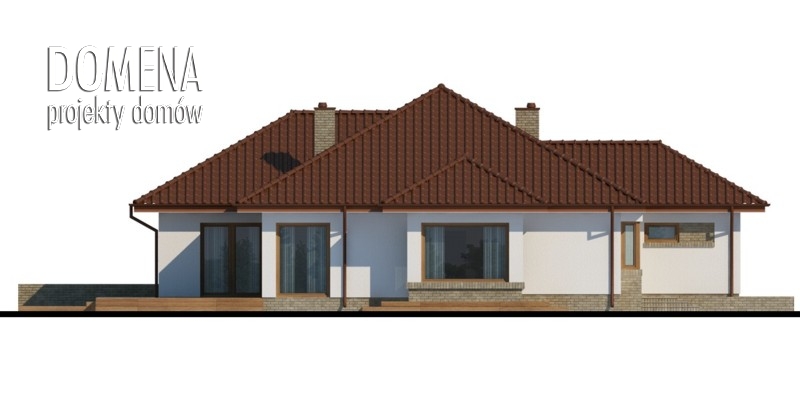 Kasandra to dom parterowy zaprojektowany dla rodziny 4-5-osobowej. Mimo nowoczesnej architektury, podkreślonej dużymi przeszkleniami i wykuszami, budynek sprawia wrażenie przytulnego i gościnnego. Po minięciu praktycznego podcienia przed głównym wejściem do domu, przechodząc przez wiatrołap, wkraczamy do strefy dziennej budynku. Stanowi ją otwarta przestrzeń, z której bez trudu wyodrębnić można salon z kominkiem, ograniczoną dużym przeszkleniem jadalnię oraz kuchnię. Szczególnie atrakcyjnie kształtuje się ta ostatnia, wyposażona w wyspę kuchenną, spiżarnię oraz blat roboczy umieszczony w ciekawy sposób w przeszklonym wykuszu. Można ją także prostymi środkami przekształcić, np. rezygnując ze spiżarni dostawić dodatkowy blat kuchenny, powiększając jednocześnie wiatrołap o miejsce dla szaf, czy dostawiając ściankę działową, z kuchni otwartej zrobić zamkniętą. W drugiej części domu mieści się strefa nocna. Składają się na nią trzy pokoje, w tym dwa z nich z osobnym wyjściem na przestronny taras. Jedna z sypialni posiada indywidualną łazienkę oraz wydzieloną przestrzeń na szafy, kosztem której możemy powiększyć bądź łazienkę, bądź samą sypialnię. Przy ogólnodostępnej łazience znajduje się pralnia, z której rezygnując zyskujemy przestronny salon kąpielowy. Strefa pomocnicza z kotłownią i garażem dostępna jest bezpośrednio z wiatrołapu. W hallu głównym, w przestrzeni oryginalnie przeznaczonej na szafy, można zamiennie usytuować schody, prowadzące na zaadaptowane na cele mieszkalne poddasze.