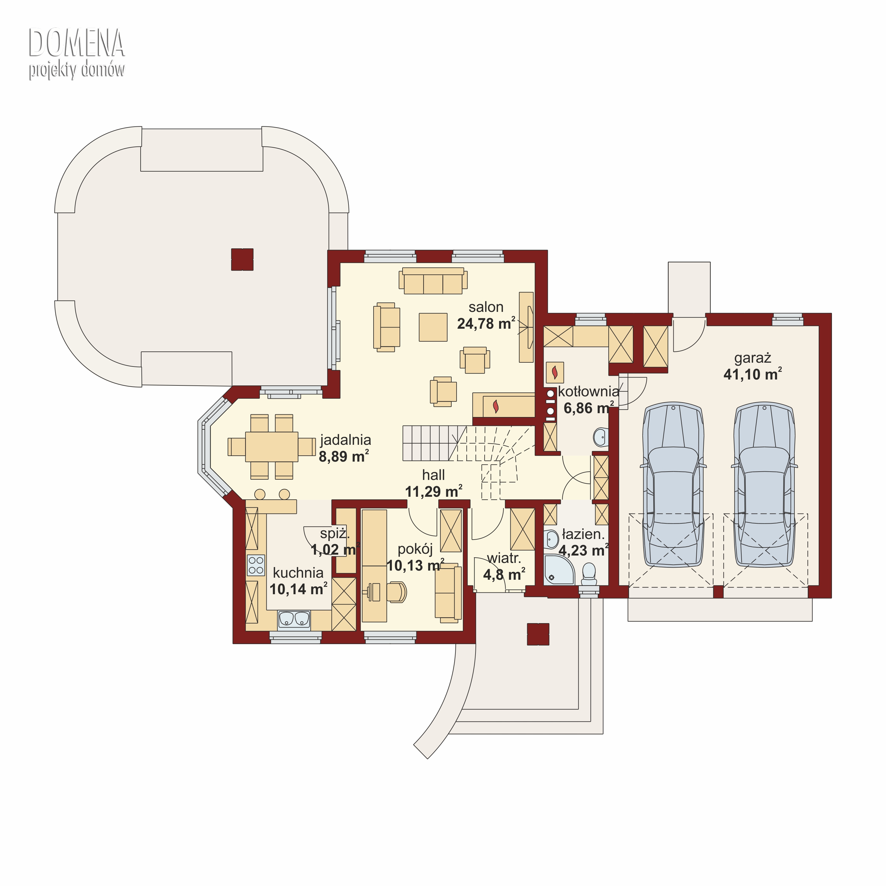 Kaspian to dom o klasycznej bryle, wyśmienicie wpisujący się w każde otoczenie. Ma on czytelny podział na trzy strefy funkcjonalne: dzienną i gospodarczą na parterze oraz nocną na poddaszu. W skład pierwszej z nich wchodzi salon z kominkiem oraz wyjściem na przekryty praktycznym zadaszeniem taras. Zaraz obok rysuje się charakterystyczna, położona w wykuszu, przestrzeń przeznaczona na jadalnię. Od kuchni dzieli ją pomysłowy barek. Cała strefa dzienna jest tak zaprojektowana, iż może funkcjonować jako jednorodna przestrzeń. Równocześnie, zarówno salon, jadalnia, jak i kuchnia, mogą stanowić osobne pomieszczenia. Zaraz przy wejściu znajduje się pokój, mogący służyć za np. gabinet czy pokój gościnny. Niejako osobną część budynku stanowi strefa gospodarcza. Przynależy do niej kotłownia, dostępna od strony mieszkalnej i garażowej oraz sam garaż, z osobnym wejściem od strony ogrodowej. Część nocna to trzy sypialnie, każda z nich z osobnym tarasem, garderoba oraz łazienka. Strych może być także zaadaptowany na dodatkowy pokój użytkowy.