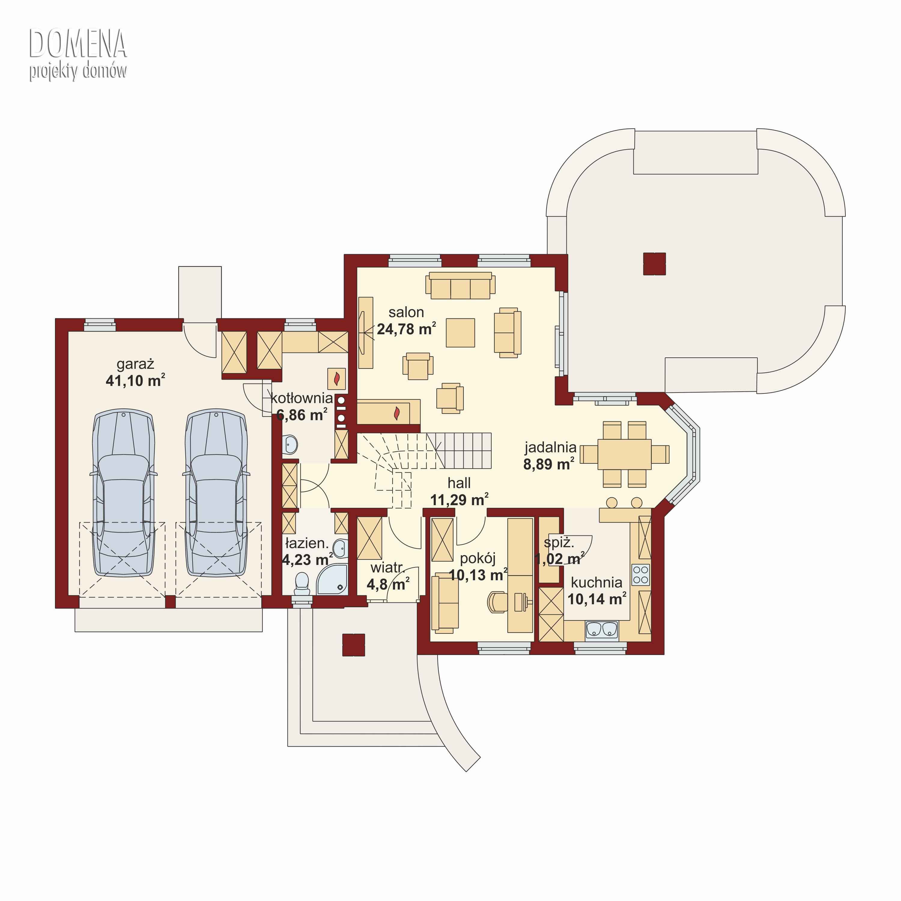 Kaspian to dom o klasycznej bryle, wyśmienicie wpisujący się w każde otoczenie. Ma on czytelny podział na trzy strefy funkcjonalne: dzienną i gospodarczą na parterze oraz nocną na poddaszu. W skład pierwszej z nich wchodzi salon z kominkiem oraz wyjściem na przekryty praktycznym zadaszeniem taras. Zaraz obok rysuje się charakterystyczna, położona w wykuszu, przestrzeń przeznaczona na jadalnię. Od kuchni dzieli ją pomysłowy barek. Cała strefa dzienna jest tak zaprojektowana, iż może funkcjonować jako jednorodna przestrzeń. Równocześnie, zarówno salon, jadalnia, jak i kuchnia, mogą stanowić osobne pomieszczenia. Zaraz przy wejściu znajduje się pokój, mogący służyć za np. gabinet czy pokój gościnny. Niejako osobną część budynku stanowi strefa gospodarcza. Przynależy do niej kotłownia, dostępna od strony mieszkalnej i garażowej oraz sam garaż, z osobnym wejściem od strony ogrodowej. Część nocna to trzy sypialnie, każda z nich z osobnym tarasem, garderoba oraz łazienka. Strych może być także zaadaptowany na dodatkowy pokój użytkowy.