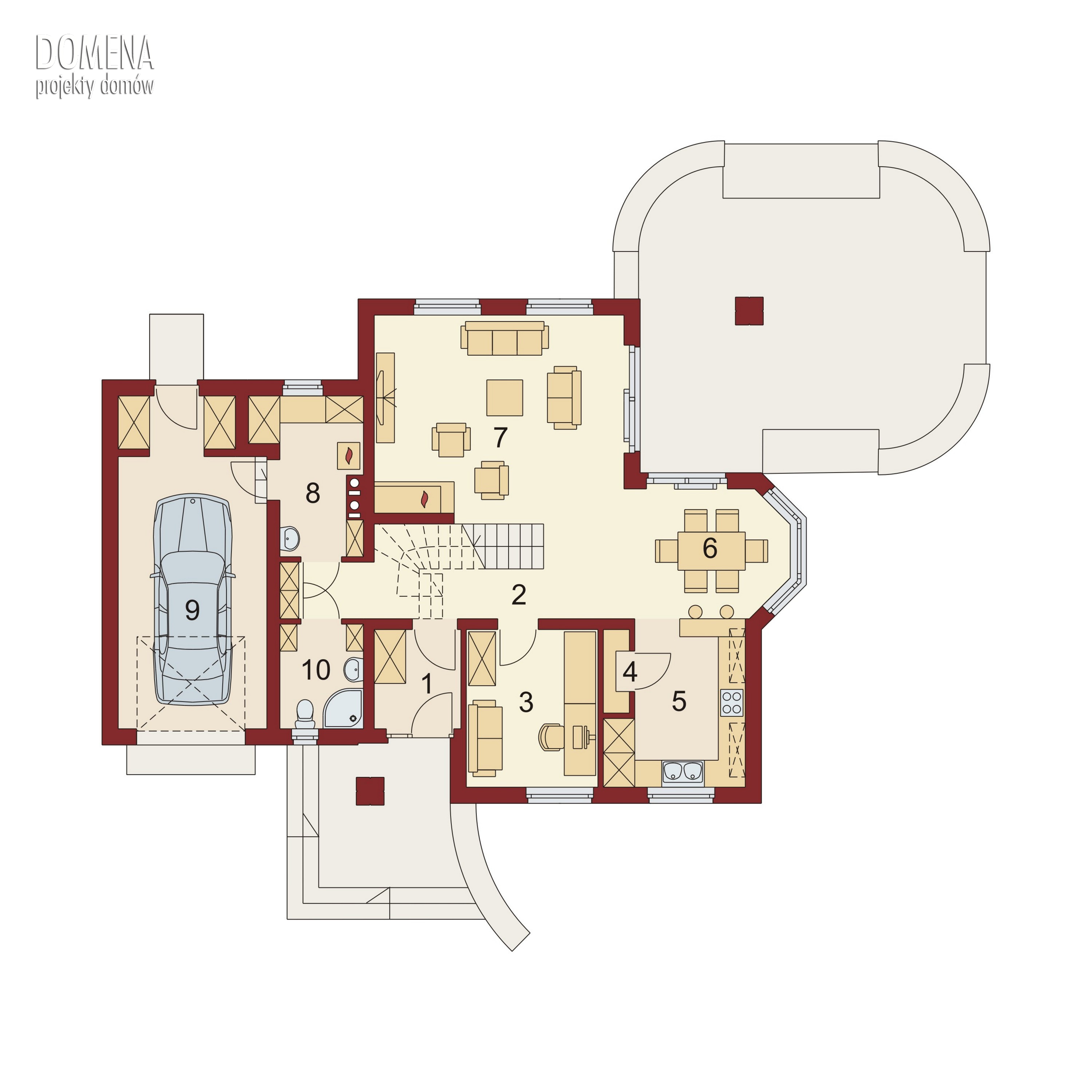 Kaspian to dom o klasycznej bryle, wyśmienicie wpisujący się w każde otoczenie. Ma on czytelny podział na trzy strefy funkcjonalne: dzienną i gospodarczą na parterze oraz nocną na poddaszu. W skład pierwszej z nich wchodzi salon z kominkiem oraz wyjściem na przekryty praktycznym zadaszeniem taras. Zaraz obok rysuje się charakterystyczna, położona w wykuszu, przestrzeń przeznaczona na jadalnię. Od kuchni dzieli ją pomysłowy barek. Cała strefa dzienna jest tak zaprojektowana, iż może funkcjonować jako jednorodna przestrzeń. Równocześnie, zarówno salon, jadalnia, jak i kuchnia, mogą stanowić osobne pomieszczenia. Zaraz przy wejściu znajduje się pokój, mogący służyć za np. gabinet czy pokój gościnny. Niejako osobną część budynku stanowi strefa gospodarcza. Przynależy do niej kotłownia, dostępna od strony mieszkalnej i garażowej oraz sam garaż, z osobnym wejściem od strony ogrodowej. Część nocna to trzy sypialnie, każda z nich z osobnym tarasem, garderoba oraz łazienka. Strych może być także zaadaptowany na dodatkowy pokój użytkowy.