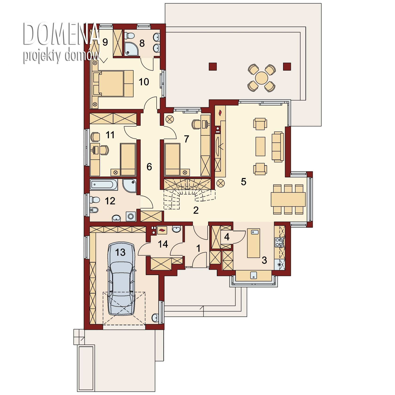 Wizualizacja jest propozycją tego jak dany projekt domu oraz jego otoczenie można zaaranżować. Sposób prowadzenia tarasu, kształt murków i elementy małej architektury typu pergole, donice itp. nie są objęte zakresem projektu. W związku z powyższym na projekcie budowlanym elementy te mogą nie być uwzględnione w projekcie ( patrz pergole ) lub zmieniony może być ich kształt i sposób prowadzenia ( wielkości tarasów, profil murków ).
