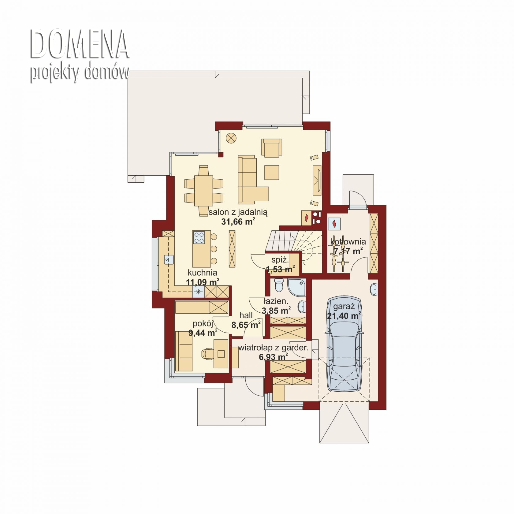 Na parterze znajduje się przestronny salon z jadalnią i wyjściem na taras, otwarta, ale łatwa do wydzielenia w ramach adaptacji kuchnia ze spiżarnią, oraz gabinet, który dzięki położeniu niedaleko wiatrołapu i łazienki, doskonale sprawdzi się także jako biuro w domu, pokój gościnny lub dodatkowa sypialnia. Pierwszorzędną funkcjonalność zapewnia dodatkowe pomieszczenie gospodarcze, przemyślnie zlokalizowane pomiędzy wiatrołapem a jednostanowiskowym garażem, z którego z kolei dostępna jest duża kotłownia z praktycznym wyjściem na zewnątrz.