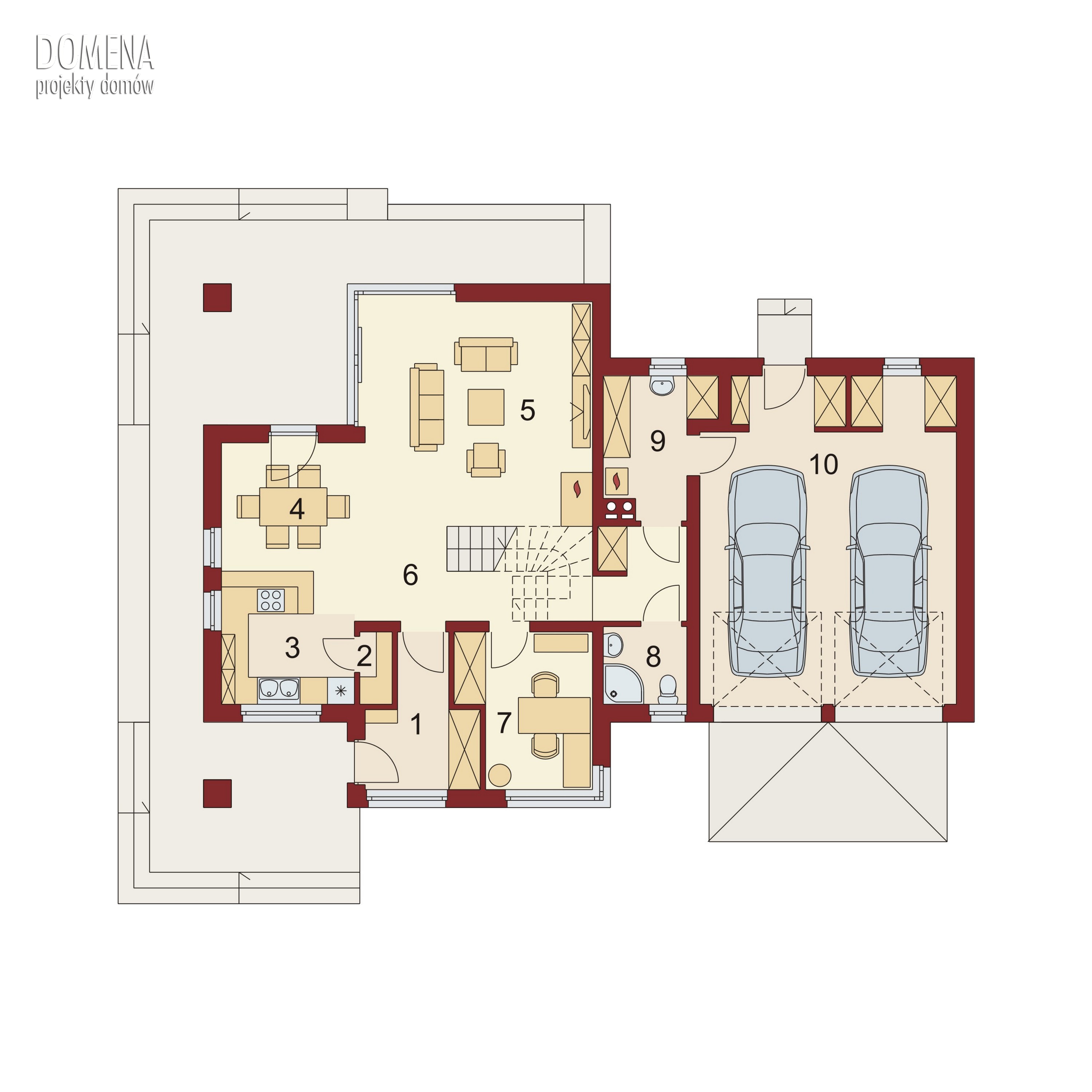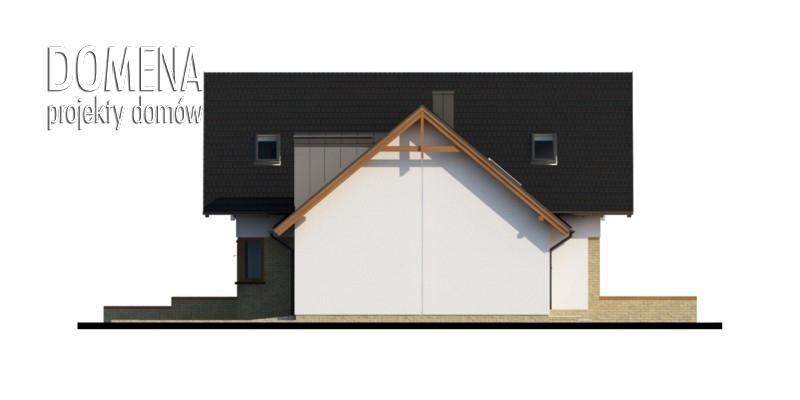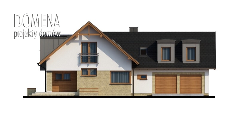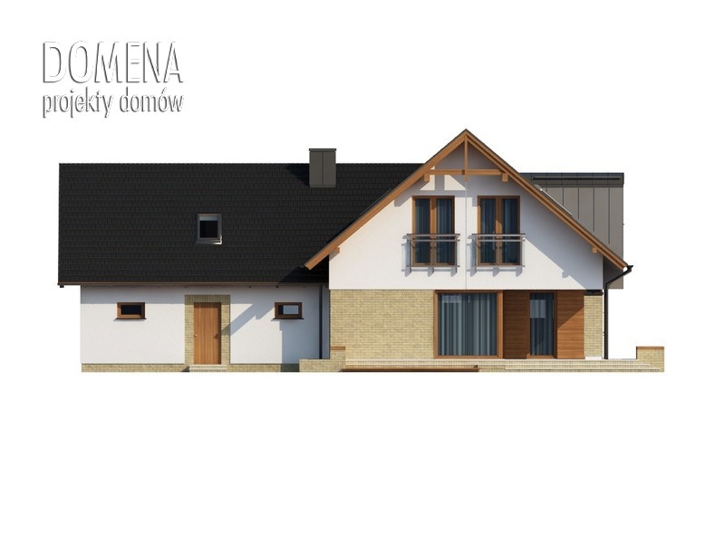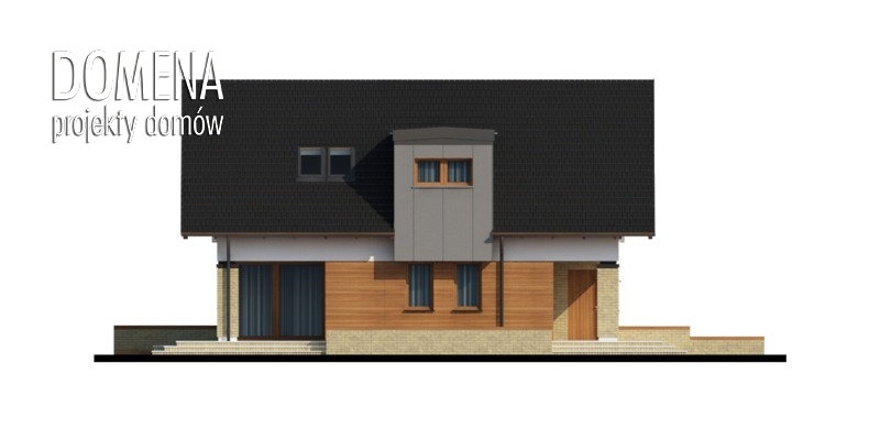 Klaudiusz to dom o klasycznej bryle, który jednak, dzięki określonemu użyciu detalu, materiałów elewacyjnych (drewno, płytka klinkierowa) oraz dużym przeszkleniom, nabiera zgoła nowoczesnego charakteru. Budynek jest przeznaczony dla rodziny 4-6 osobowej. Po minięciu zadaszonej strefy wejściowej oraz wiatrołapu, wkraczamy w strefę dzienną domu. Salon, z okazałym oknem balkonowym i widokiem na zadaszony taras, graniczy z jadalnią, swobodnie przechodzącą w kuchnię ze spiżarnią. Dzięki dostawieniu ścianki działowej możemy kuchnię otwartą przekształcić w zamkniętą. Natomiast ścianka działowa umiejscowiona pomiędzy salonem a hallem odseparuje od siebie te dwie przestrzenie i pozwoli na zastosowanie szafy wnękowej pod schodami. Strefę wejściową można poddać drobnym transformacjom. Wiatrołap można powiększyć o dodatkową przestrzeń na szafy kosztem spiżarni. Praktycznie sytuowany przy wejściu gabinet/pokój gościnny może natomiast być powiększony kosztem szaf w wiatrołapie oraz (co ważne w przypadku gabinetu) dostępny bezpośrednio z przedsionka. Wyraźnie odseparowana od dziennej jest strefa gospodarcza. Składa się na nią kotłownia oraz dostępny z niej garaż z wydzieloną przestrzenią składową i osobnym wyjściem od strony ogrodu. Pierwsze piętro w całości stanowi strefa nocna: trzy sypialnie z portfenetrami, w tym jedna z osobną garderobą oraz przestronna, wygodna łazienka. Dostępny z półpiętra strych można także przekształcić w część użytkową domu – dodatkową sypialnię, czy pokój hobby.