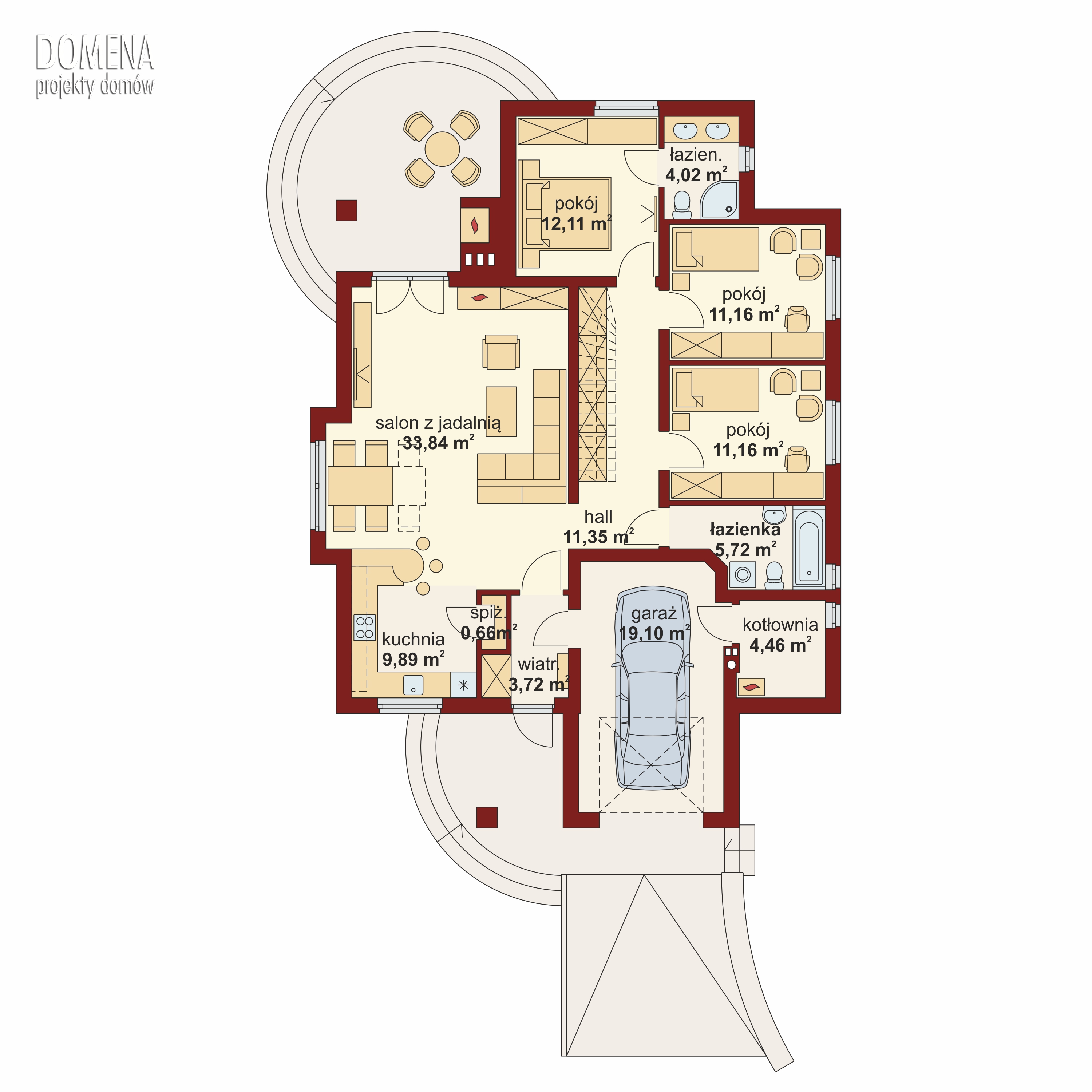 Atrakcyjny dom parterowy z poddaszem nieużytkowym. Już z zewnątrz zwraca uwagę niebanalnym wejściem od frontu budynku. Dom słoneczny, doświetlony praktycznie o każdej porze dnia. Posiada sensowne i pomysłowe oddzielenie strefy dziennej od nocnej, z możliwością całkowitego oddzielenia wyżej wymienionych stref. Dodatkową prywatność w strefie nocnej, zapewni gospodarzom oddzielna łazienka dostępna z sypialni rodziców. Kuchnia z wkomponowanym barkiem oraz spiżarnią, otwarta na jadalnie i salon. Niewątpliwym walorem domku jest obszerny, zadaszony taras z kominkiem – grillem. Pozwoli na wspólne spędzanie czasu na świeżym powietrzu, także podczas dżdżystych dni.