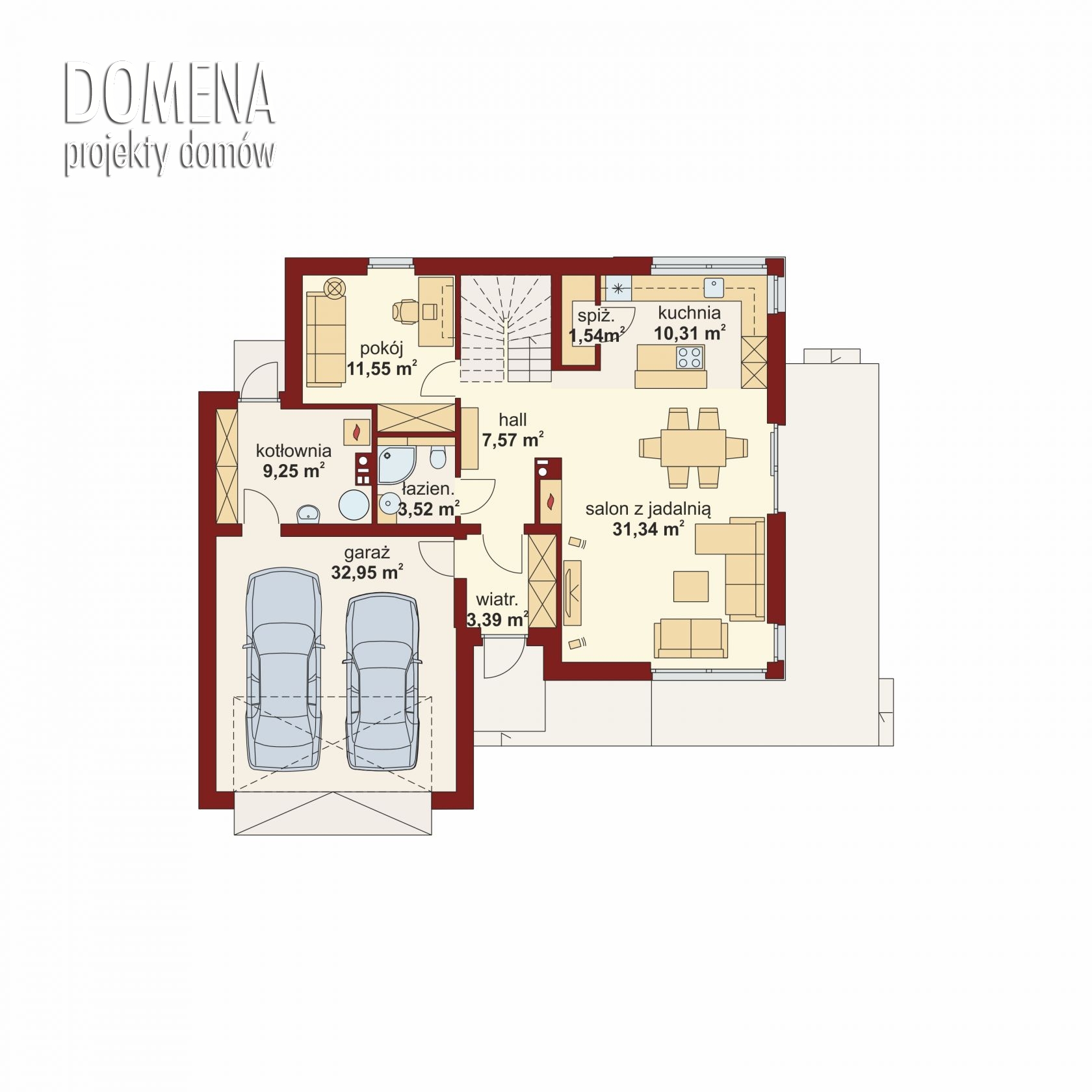 KORSO 2 PS to dom parterowy z poddaszem użytkowym, zaprojektowany dla 4-5-osobowej rodziny. Zwrócić na niego uwagę powinni szczególnie posiadacze działek z wjazdem od południa. Za wyposażonym w praktyczną garderobę wiatrołapie, po jednej stronie ukazuje się obszerny salon z jadalnią i kuchnia- tę ostatnią można łatwo zamknąć ścianą. Dopełnieniem dla kuchni jest użyteczna spiżarnia. Na parterze znajduje się także łazienka oraz gabinet, który może pełnić rolę pokoju gościnnego lub kolejnej sypialni. Z przedsionka dostępny jest również dwustanowiskowy garaż z funkcjonalnym przejściem do dużej kotłowni, z której z kolei możemy dostać się bezpośrednio na zewnątrz budynku. Na poddaszu znajduje się strefa nocna domu, która składa się z trzech sypialni, ogólnodostępnej łazienki połączonej z praktyczną pralnią oraz połączonej z główną sypialnią garderoby.