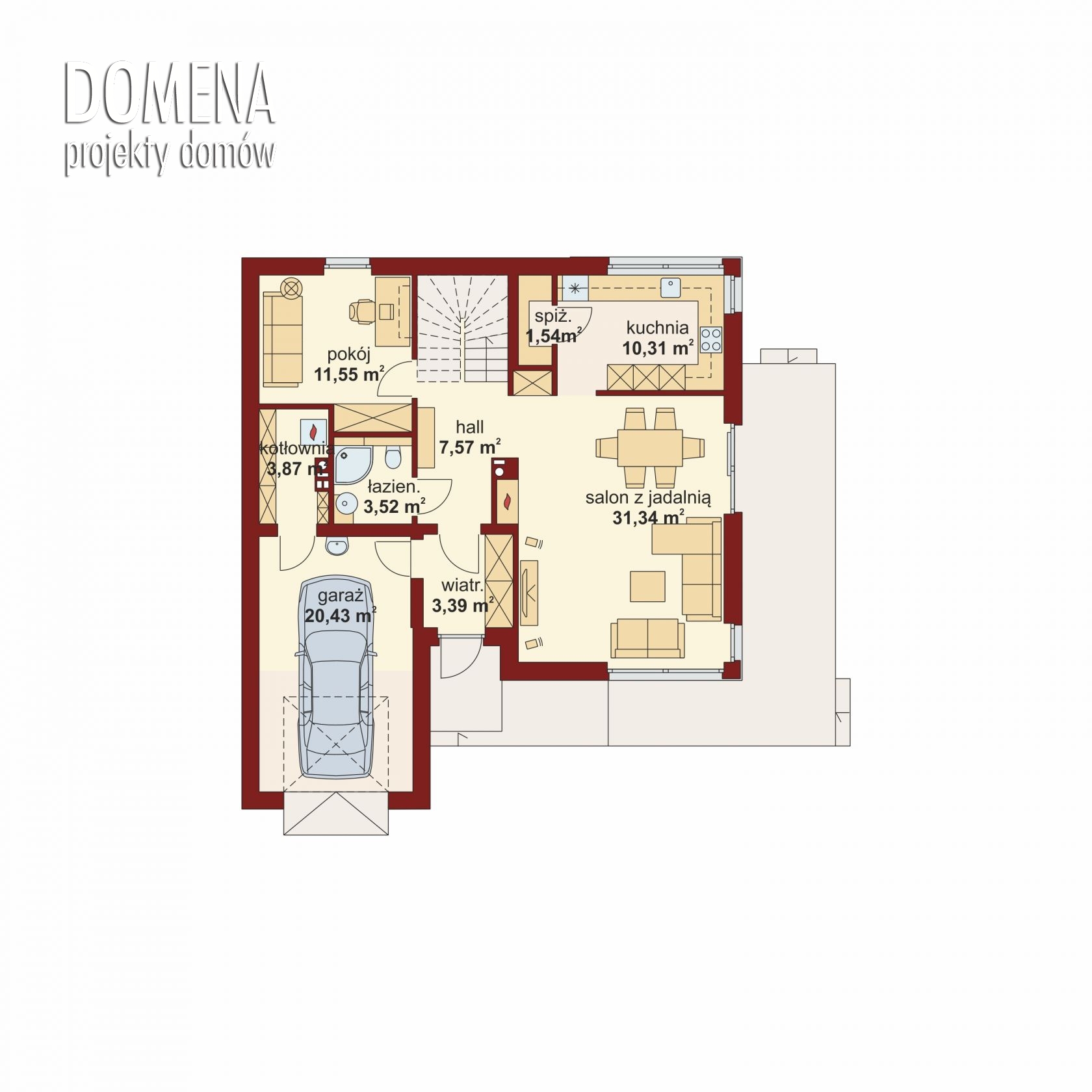 KORSO to dom parterowy z poddaszem użytkowym, zaprojektowany dla 4-5-osobowej rodziny. Zwrócić na niego uwagę powinni szczególnie posiadacze działek z wjazdem od południa. Za wyposażonym w praktyczną garderobę wiatrołapie, po jednej stronie ukazuje się obszerny salon z jadalnią i wejście do kuchni- tę ostatnią można łatwo połączyć z salonem. Dopełnieniem dla kuchni jest użyteczna spiżarnia. Na parterze znajduje się także łazienka oraz gabinet, który może pełnić rolę pokoju gościnnego lub kolejnej sypialni. Z przedsionka dostępny jest również garaż z funkcjonalnym przejściem do kotłowni. Na poddaszu znajduje się strefa nocna domu, która składa się z trzech sypialni, ogólnodostępnej łazienki połączonej z praktyczną pralnią oraz połączonej z główną sypialnią garderoby.