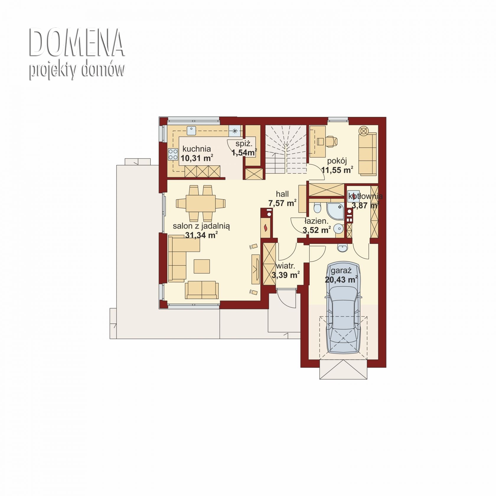 KORSO to dom parterowy z poddaszem użytkowym, zaprojektowany dla 4-5-osobowej rodziny. Zwrócić na niego uwagę powinni szczególnie posiadacze działek z wjazdem od południa. Za wyposażonym w praktyczną garderobę wiatrołapie, po jednej stronie ukazuje się obszerny salon z jadalnią i wejście do kuchni- tę ostatnią można łatwo połączyć z salonem. Dopełnieniem dla kuchni jest użyteczna spiżarnia. Na parterze znajduje się także łazienka oraz gabinet, który może pełnić rolę pokoju gościnnego lub kolejnej sypialni. Z przedsionka dostępny jest również garaż z funkcjonalnym przejściem do kotłowni. Na poddaszu znajduje się strefa nocna domu, która składa się z trzech sypialni, ogólnodostępnej łazienki połączonej z praktyczną pralnią oraz połączonej z główną sypialnią garderoby.