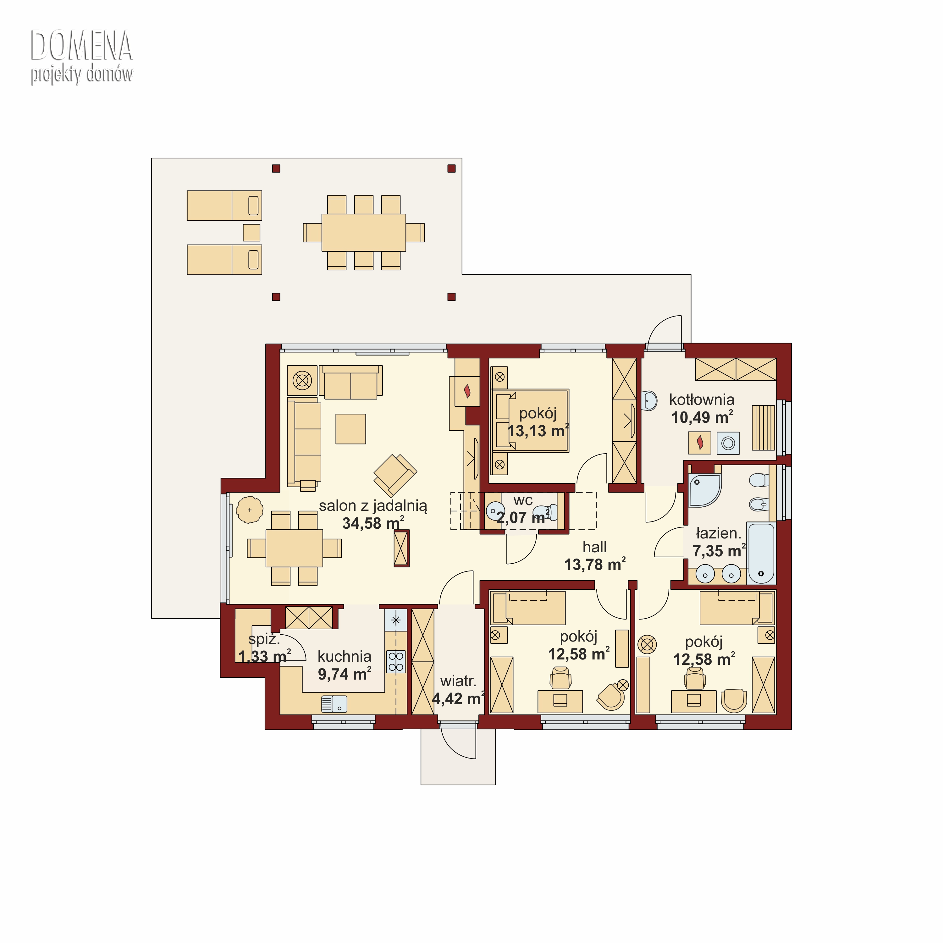 LENA 3 PS została zaprojektowana dla 4-osobowej rodziny. Przez wygodny przedsionek z miejscem na szafę, wchodzimy do przestronnego salonu połączonego z jadalnią. Okazała kuchnia ze spiżarnią jest od nich oddzielona, ale z łatwością można ją połączyć z resztą strefy dziennej. Przy przejściu do zacisznej części nocnej znajduje się dogodnie umiejscowiona toaleta, za którą znajdują się trzy obszerne sypialnie, bogato wyposażona łazienka, oraz duże pomieszczenie gospodarcze z praktycznym wyjściem do ogrodu.