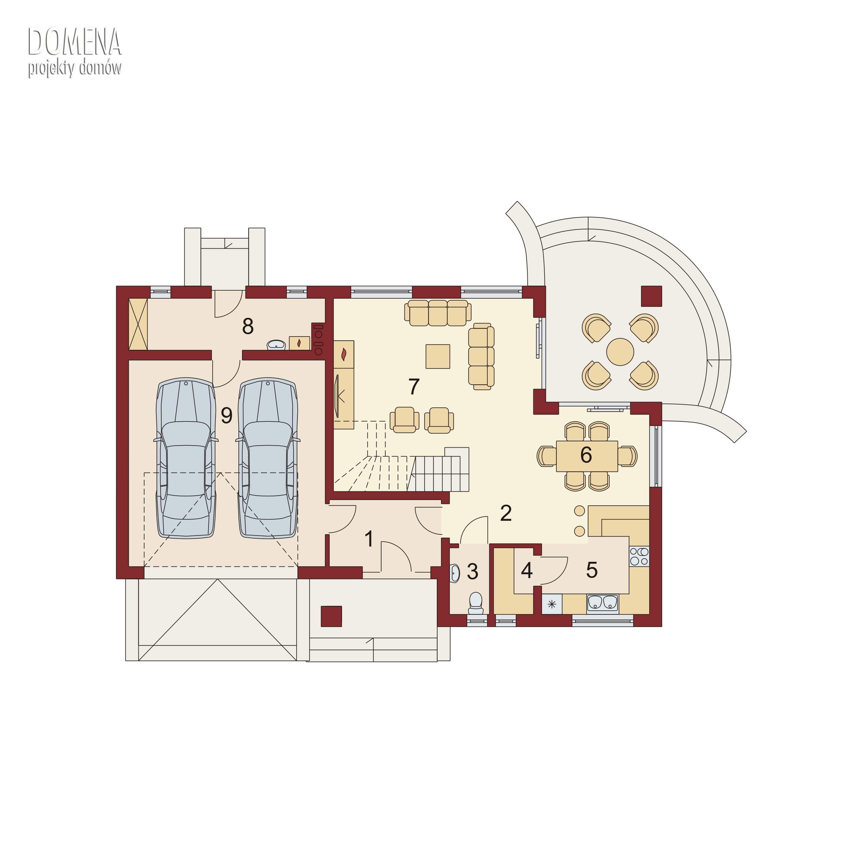 Wyjście na taras z salonu i jadalni oraz bliska lokalizacja kuchni pozwala na wygodne użytkowanie tarasu w trakcie letnich przyjęć.