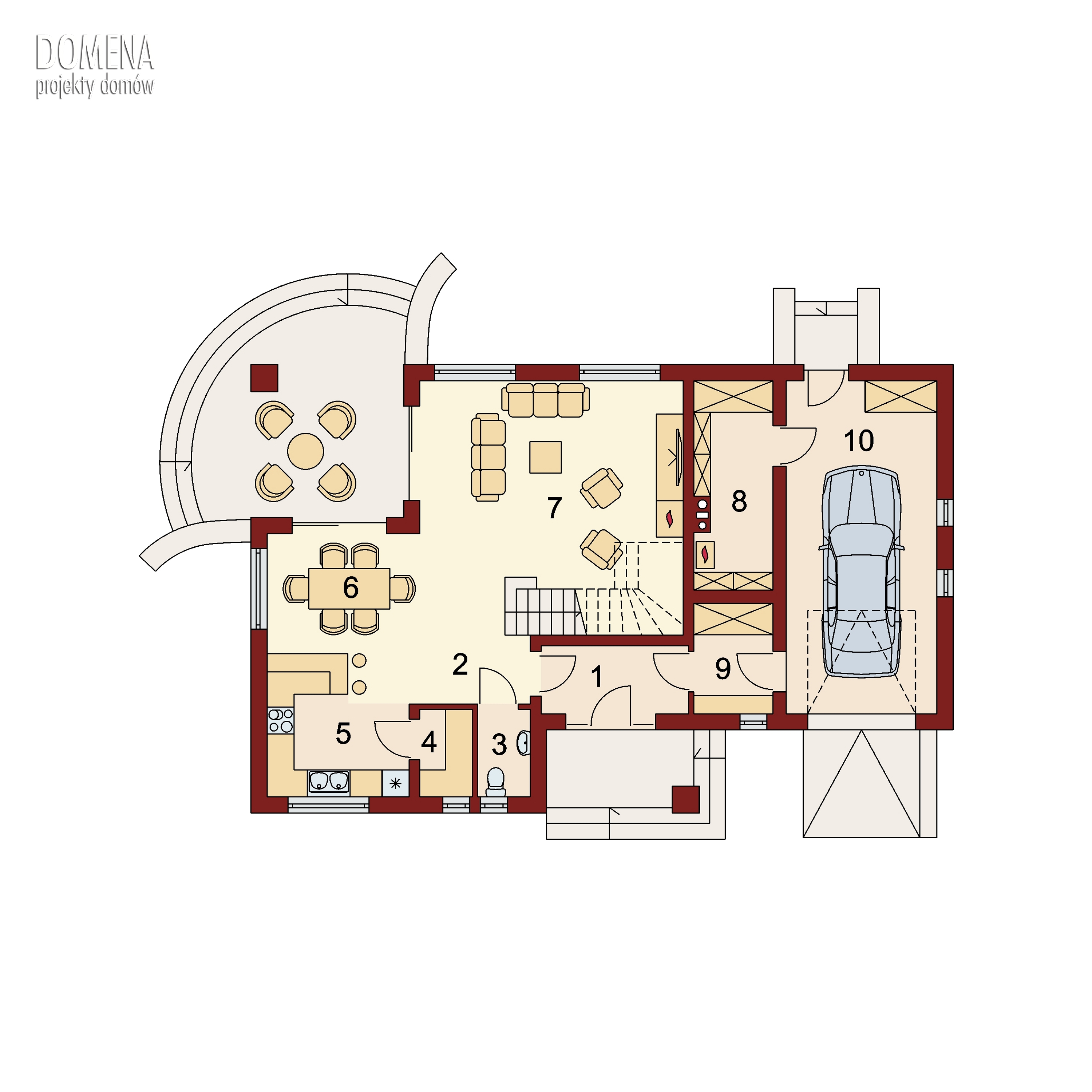 Wyjście na taras z salonu i jadalni oraz bliska lokalizacja kuchni pozwala na wygodne użytkowanie tarasu w trakcie letnich przyjęć.