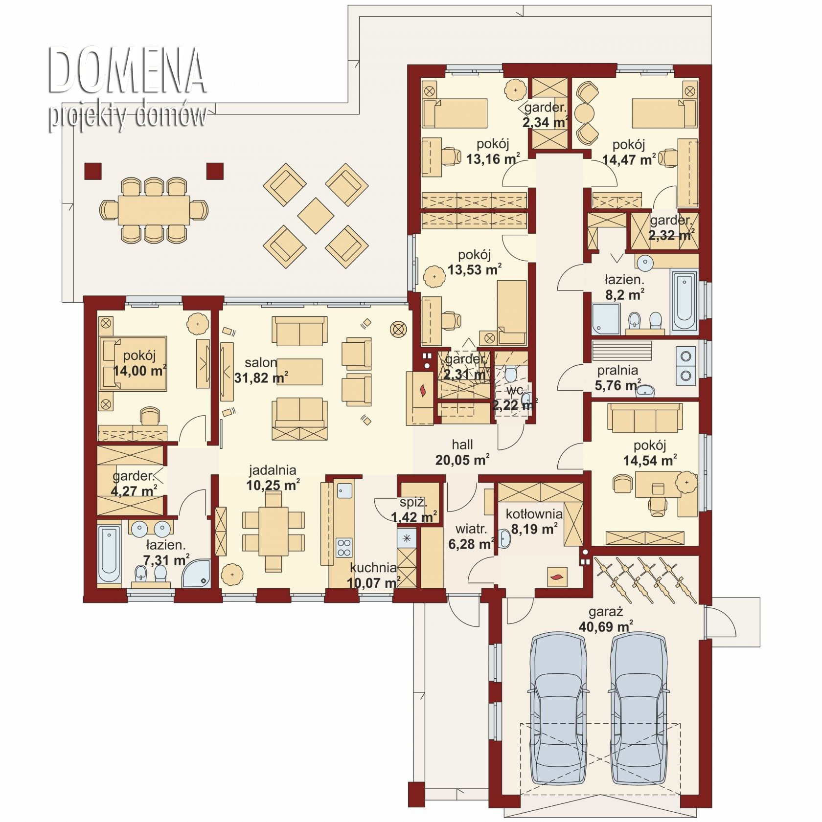 OTTO 2 PS to luksusowy dom parterowy, który zaspokoi wszelkie wymagania 5-6 osób. Przemyślne usytuowanie przedsionka zapewnia jednoczesny dostęp do garażu, części dziennej i nocnej budynku, a w razie potrzeby także poddasza zaadaptowanego na cele mieszkalne. Oddzieloną barkiem kuchnię i jadalnię oraz przestronny salon, można w razie potrzeby wydzielić jako osobne pomieszczenia ze względu na ich doskonałe doświetlenie. Ekskluzywne rozwiązanie w postaci wydzielenia strefy głównej sypialni z własną łazienką i garderobą, zapewnia bezpośredni dostęp do części dziennej oraz zadaszonego tarasu. Przy przejściu do zacisznej części nocnej znajduje się toaleta i podręczne schowki, za którymi usytuowane są trzy obszerne sypialnie z własnymi garderobami, przestronny gabinet, łazienka z wydzielonym pomieszczeniem pomocniczym oraz pralnia. Wzorową funkcjonalność domu dopełnia duże pomieszczenie gospodarcze z przejściem do wygodnego garażu z aneksem magazynowym i praktycznym wyjściem do ogrodu.