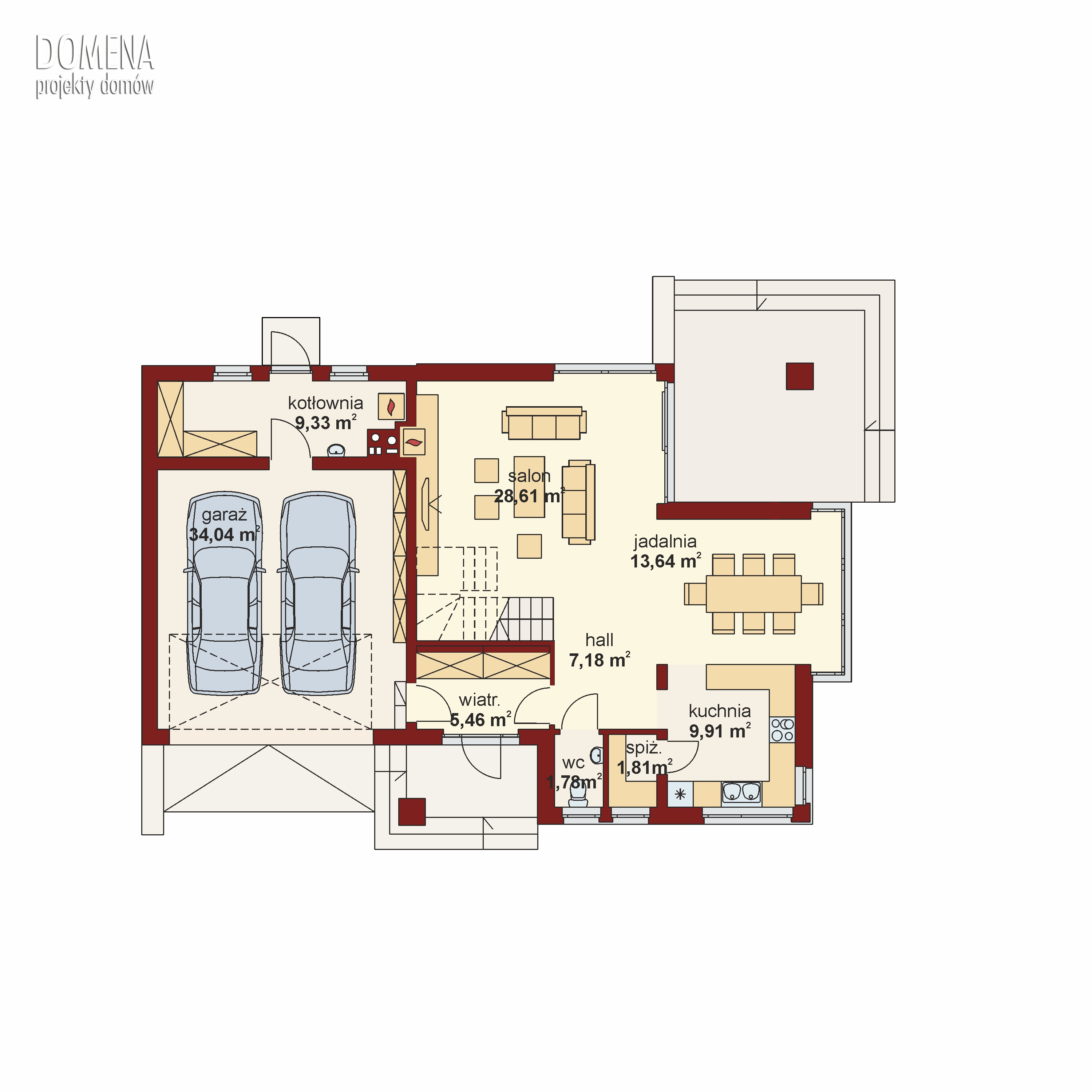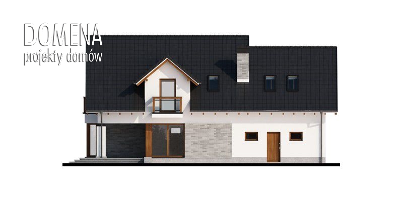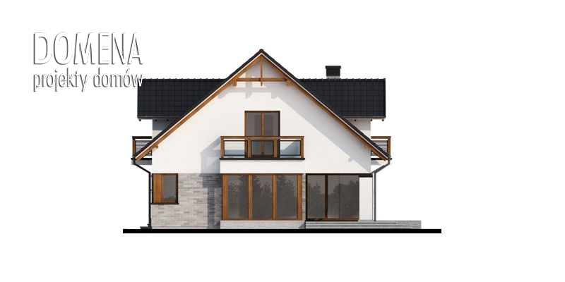 Peronia 2 to wygodny dom parterowy z poddaszem użytkowym przeznaczony dla 4 osobowej rodziny, z ciekawą elewacją z elementami kamienia oraz dużymi przeszkleniami. Dzięki nim cała przestrzeń jest dobrze doświetlona światłem słonecznym. Dom posiada widoczny podział na strefy: dzienną, gospodarczą oraz nocną. Ta pierwsza to zlokalizowana na parterze otwarta przestrzeń, na którą składa się salon z kominkiem, jadalnia a także kuchnia ze spiżarnią. Dzięki zastosowaniu ścianki działowej, zwolennicy kuchni zamkniętych mogą wydzielić samą kuchnię lub wraz z jadalnią. Wspomniane duże przeszklenia umożliwiają wyjście na taras zarówno z salonu jak i jadalni. Ustawny wiatrołap z szafami wnękowymi łączy strefę dzienną domu ze strefą gospodarczą, w skład której wchodzi dwustanowiskowy garaż z miejscem na ciąg regałów oraz pomieszczenie gospodarcze pełniące funkcję kotłowni, z dodatkowym wyjściem na ogród. Poddasze to w całości strefa nocna. Stanowią ją trzy sypialnie, każda z wyjściem na balkon, a dwie dodatkowo z garderobą. Sypialnia dwuosobowa posiada także indywidualną łazienkę. Zaprojektowany jako nieużytkowy strych można zaadaptować na dodatkowy pokój sypialny, czy pokój hobby.