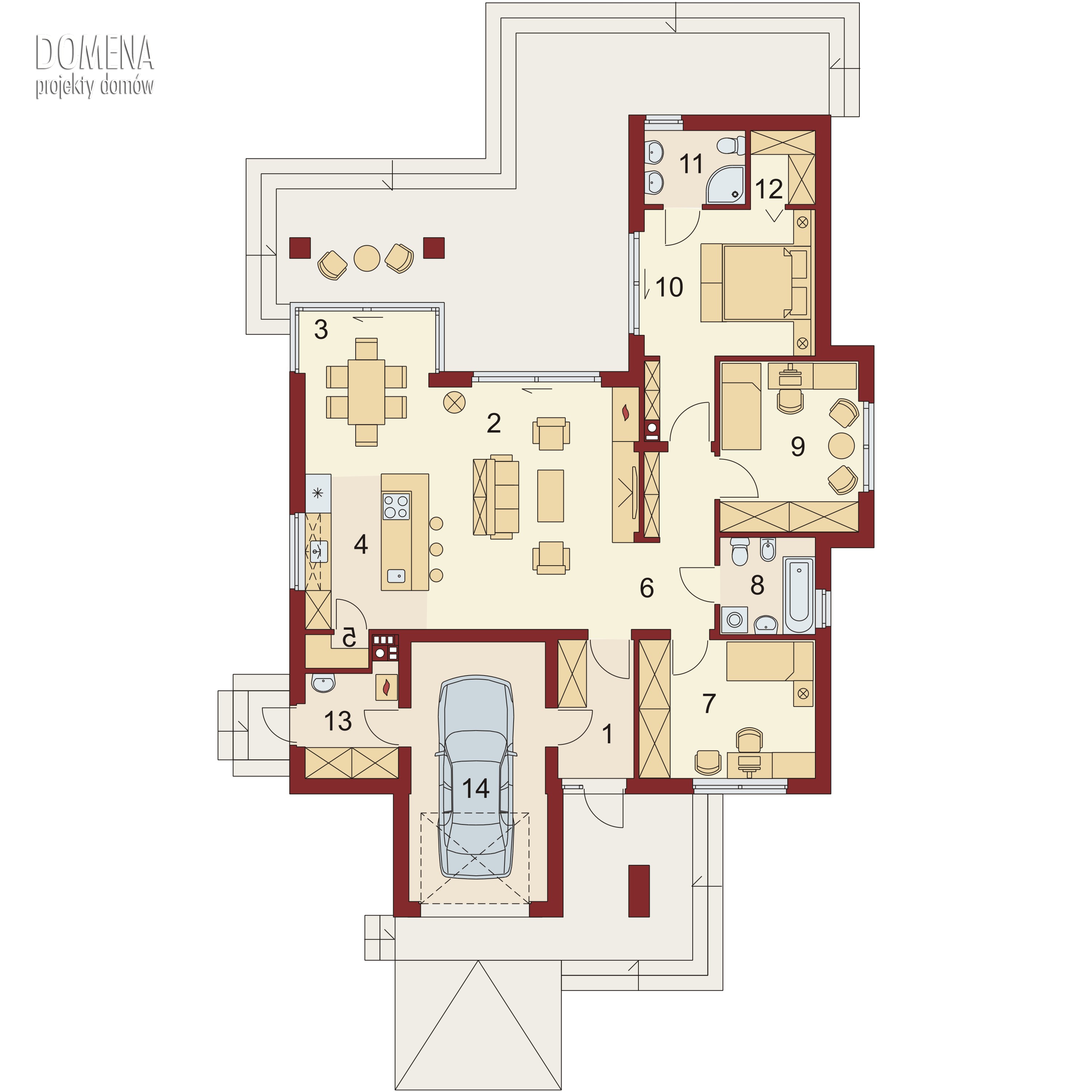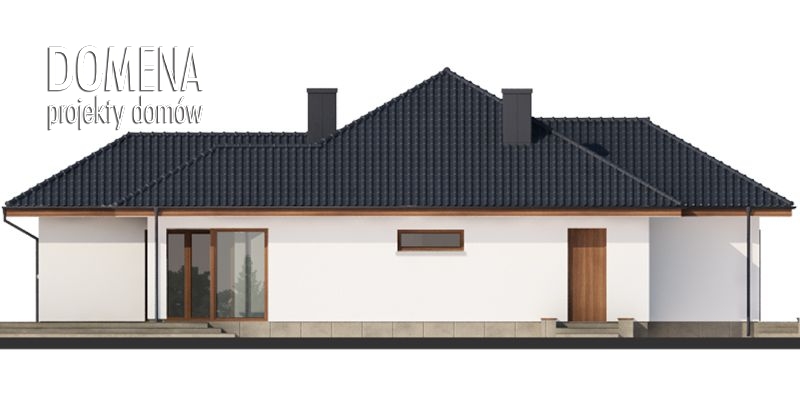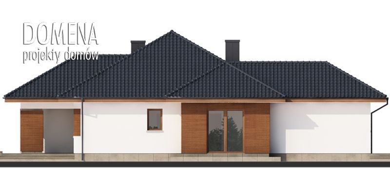 Platon to dom parterowy zaprojektowany dla rodziny 4-osobowej. Jego niewątpliwym atutem jest obszerny salon z kominkiem połączony z kuchnią i jadalnią. W pomieszczeniu uwagę przyciągają zwłaszcza duże przeszklenia, gwarantujące bardzo dobre doświetlenie oraz usytuowana w przeszklonej niszy jadalnia. Z tego zaprojektowanego jako jednoprzestrzenne pomieszczenia zarówno kuchnię jak i jadalnię można wydzielić ścianką działową. Wyjście na zadaszony taras jest możliwe zarówno właśnie z tej części domu, jak również z sypialni głównej. Dom ma wyraźny podział na strefy funkcjonalne: dzienną, nocną i gospodarczą. Pierwsza z nich – wspomniany salon z jadalnią i kuchnią oraz przynależna do niej spiżarnia – znajduje się na wprost głównego wejścia. Strefa nocna zajmuje całą naprzeciwległą część budynku. Składają się na nią trzy sypialnie, w tym jedna z indywidualną garderobą oraz łazienką oraz łazienka ogólnodostępna. Część gospodarcza to jednostanowiskowy garaż z wejściem od strony wiatrołapu oraz pomieszczenie gospodarcze dostępne z garażu i posiadające praktyczne drugie wejście od strony ogrodowej. Jego powierzchnię można powiększyć, decydując się na rezygnację ze spiżarni.