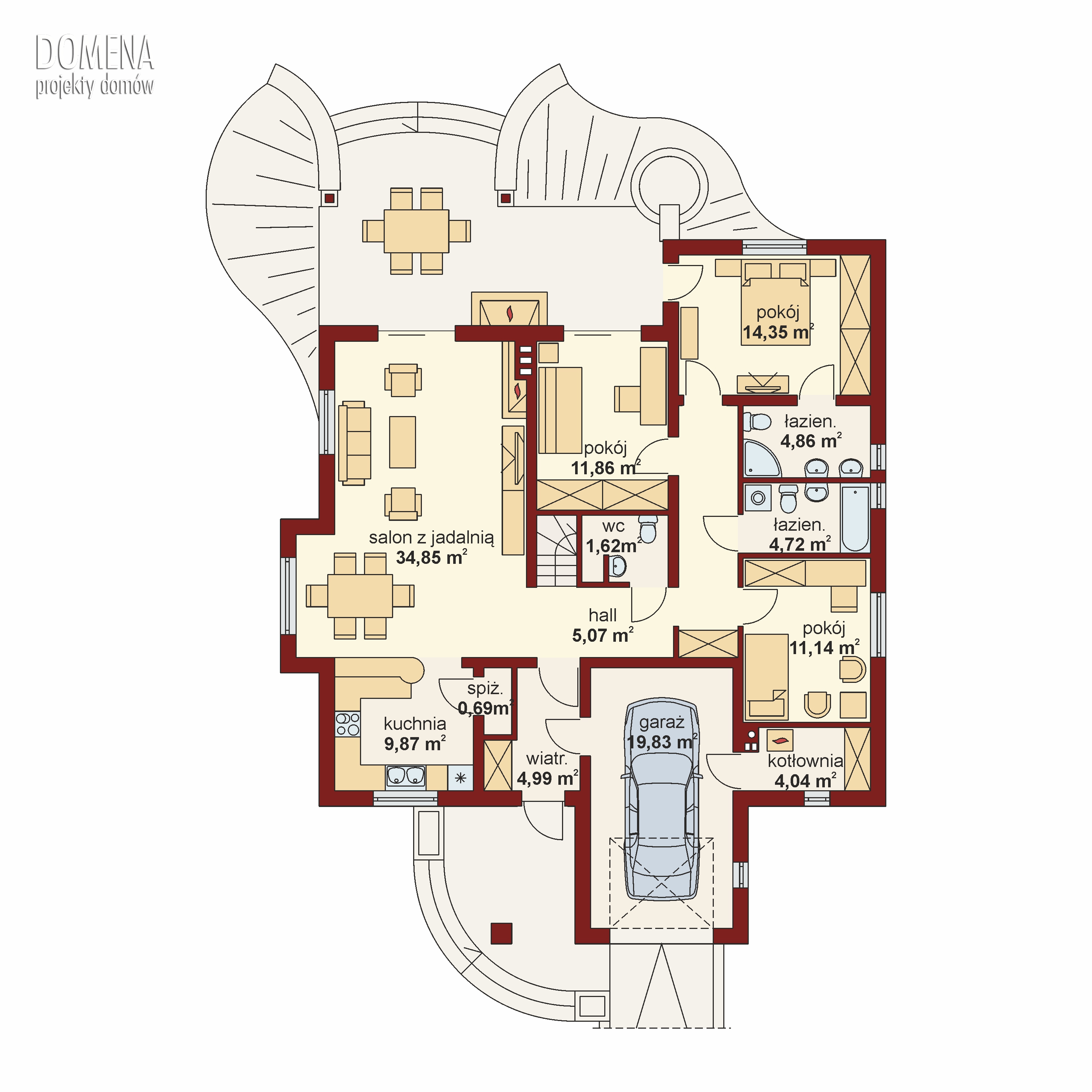 Atrakcyjny dom parterowy z poddaszem nieużytkowym. Już z zewnątrz zwraca uwagę niebanalnym wejściem od frontu budynku. Dom słoneczny, doświetlony praktycznie o każdej porze dnia. Posiada sensowne i pomysłowe oddzielenie strefy dziennej od nocnej, z możliwością całkowitego oddzielenia wyżej wymienionych stref. Dodatkową prywatność w strefie nocnej, zapewni gospodarzom oddzielna łazienka dostępna z sypialni rodziców. Kuchnia z wkomponowanym barkiem oraz spiżarnią, otwarta na jadalnie i salon. Niewątpliwym walorem domku jest obszerny, zadaszony taras z kominkiem – grillem. Pozwoli na wspólne spędzanie czasu na świeżym powietrzu, także podczas dżdżystych dni. Atutem tego praktycznego domku jest późniejsza możliwość adaptacji poddasza, około 40m2, na pomieszczenia mieszkalne.
